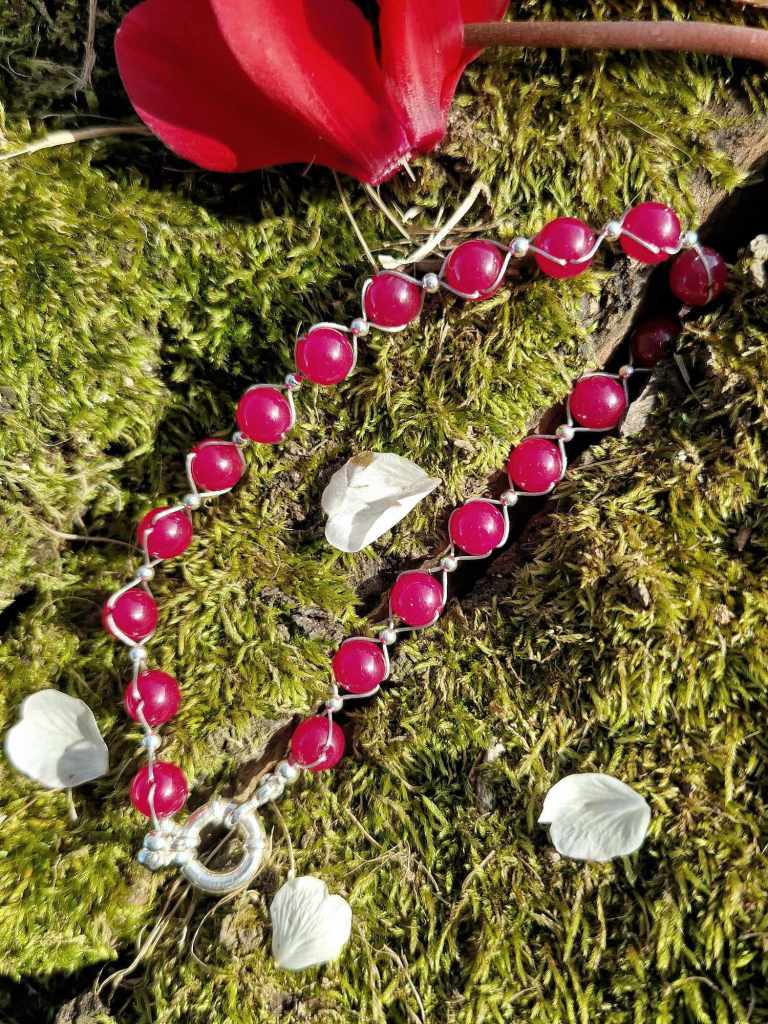 Magnifique bracelet tressé de rubis et de perles d’argent. Fermoir bouée argent 925.