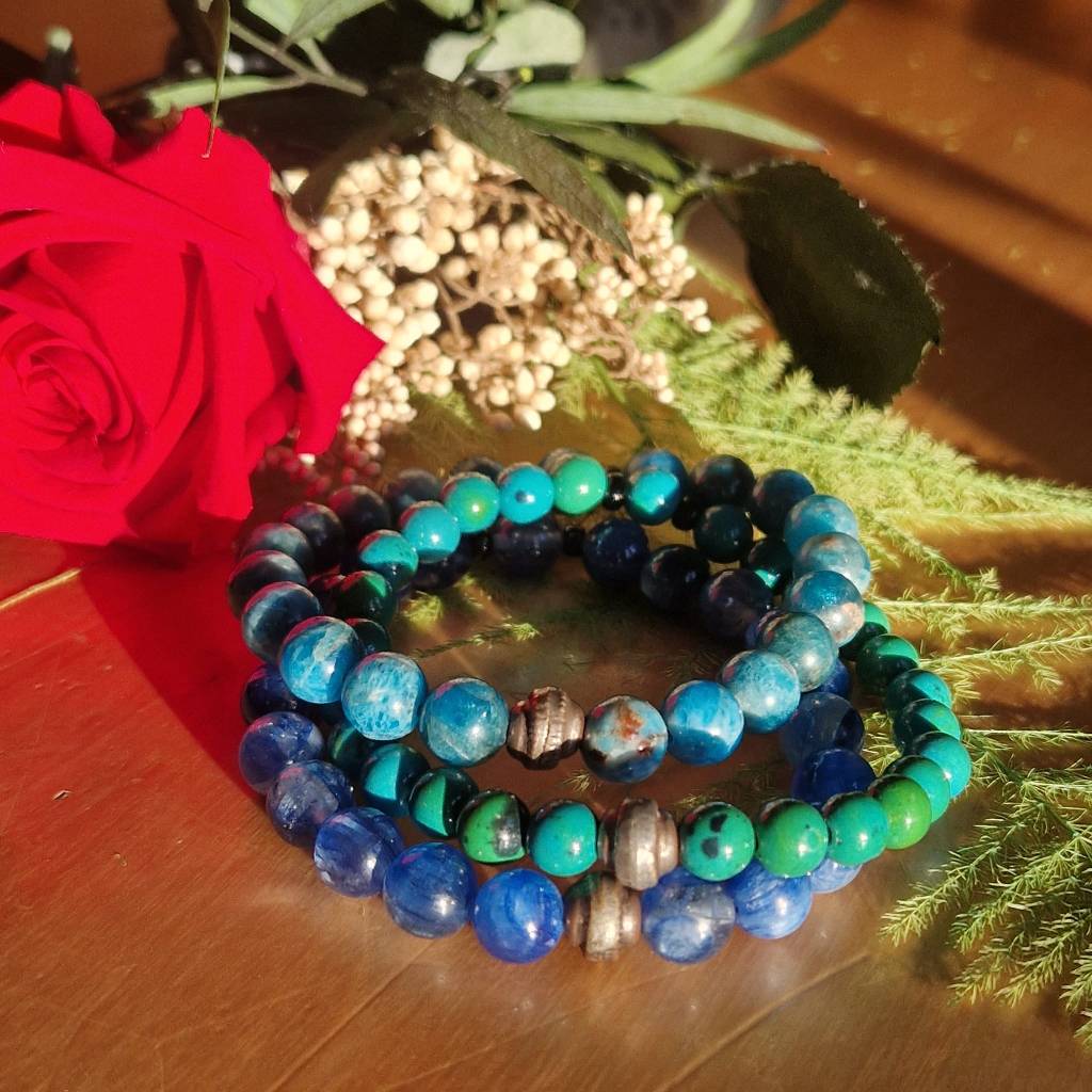 Voici trois bracelets-mala, trois pierres pour se ressourcer, s’apaiser, mieux communiquer en étant plus serein (e). Il y a fameuse la cyanite, très recherchée, mais aussi de l’apatite et de la chrysocolle. Trois pierres d’apaisement et, surtout, d’harmonie. Pour se sentir plus aligné(e) et en accord avec ses choix !