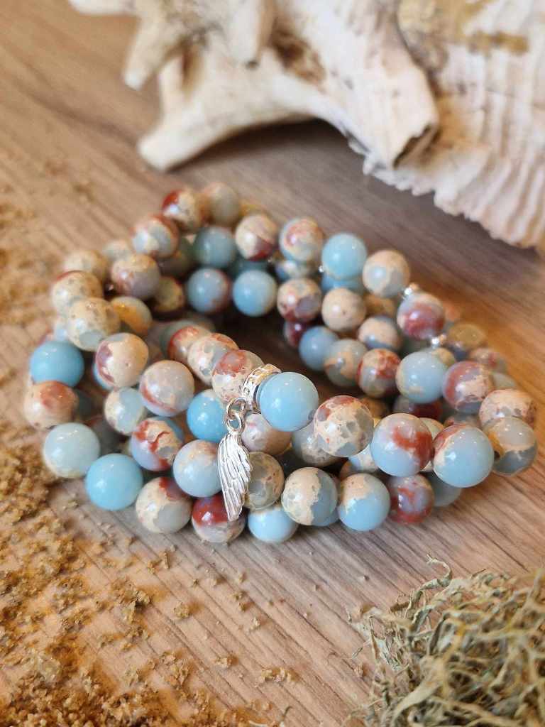Mala de jaspe impérial bleu du Shoushan, région lacustre de Chine. Parfois huilé pour lui donner un peu plus de translucidité, il évoque les océans tranquilles et les lagunes paisibles. C’est une pierre sédimentaire, indiquée lorsque nous devons nous renouveler ou nous reconstruire après la fin d’une période de notre vie. Le jaspe du Shoushan est connu depuis longtemps, mais les pièces anciennes s’oxydent et prennent souvent un côté un peu plus grisé et opaque. Depuis quelques années, le jaspe du Shoushan est donc huilé pour stabiliser la couleur et réduire le phénomène d’oxydation.