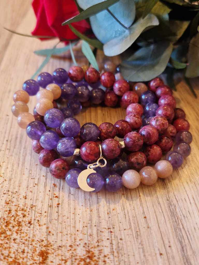Magnifique mala de 108 perles naturelles de pierres de lune, d’améthyste et de rhodonite foncée du Mexique, aux teintes caractéristiques rose intense. C’est le mala parfait pour retrouver son calme en cas de stress, la confiance en soi et l’optimisme. Douceur et réassurance pour ce très beau collier de méditation qui se porte aussi en multirangs autour du poignet pour vous accompagner toute la journée de ses belles énergies !