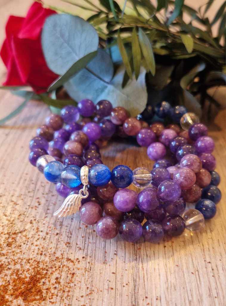 Des perles de cyanite, améthyste et lépidolite pour un mala à porter tout près de soi, en collier ou en bracelet !
