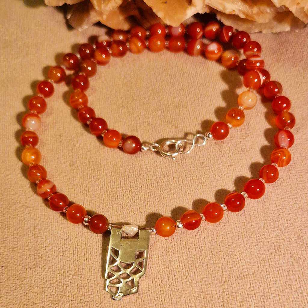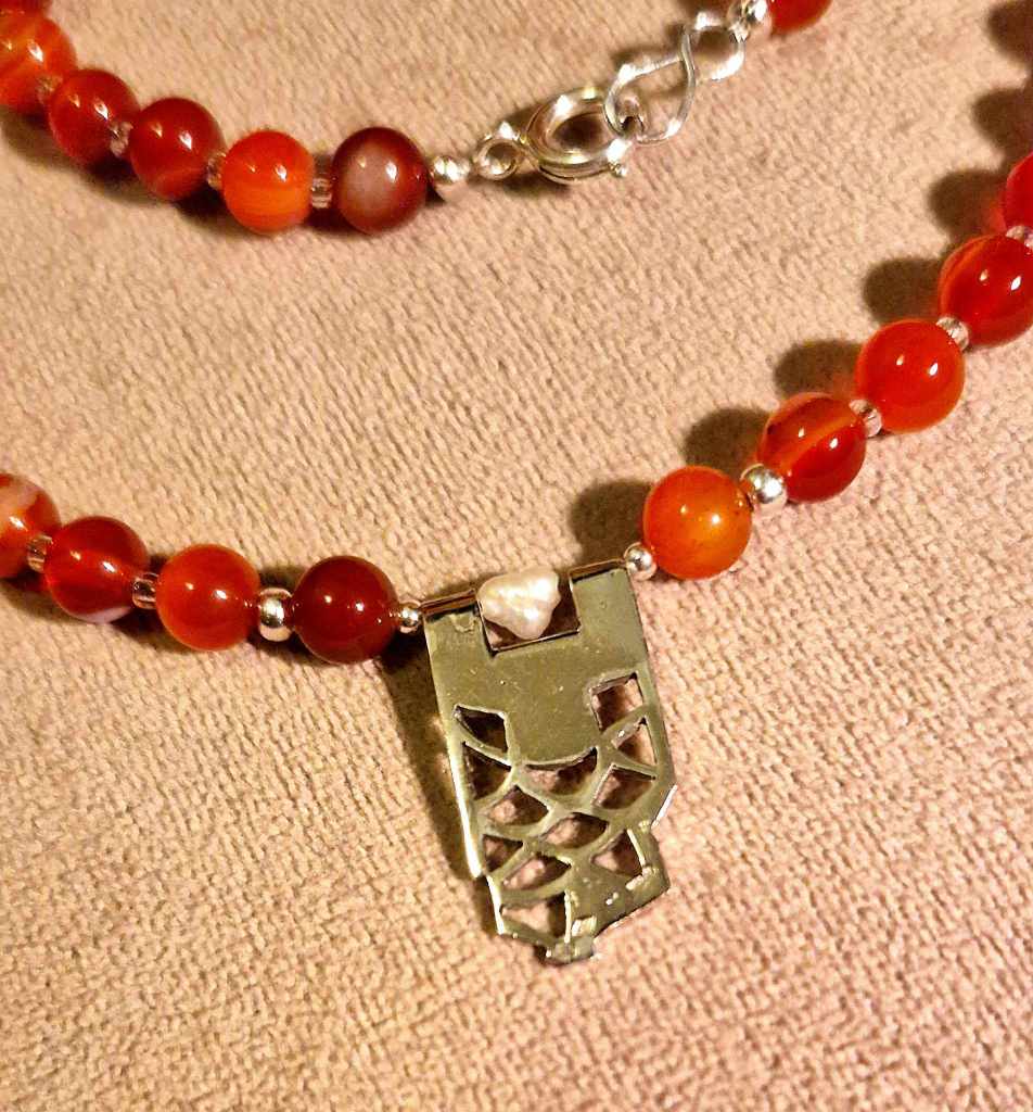 Superbe collier en cornaline, retenant en pendentif un élément de boucle en argent massif 925 de l’époque art deco, poinçonné et signé par son orfèvre (Niral). Le pendentif est en argent repercé de motifs triangulaires et accueille en sa partie supérieure une perle baroque en forme de cœur.