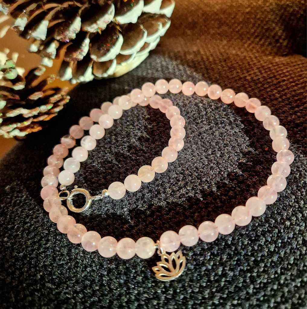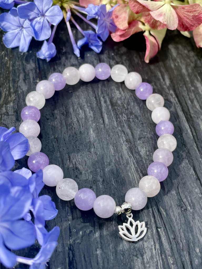 Bracelet alterné d’améthyste et de quartz rose très pâle pour un savant mélange doux de pastels mauves. L’améthyste favorise la connexion à la spiritualité, le quartz rose nous relie à notre cœur. Idéal pour apaiser le mental et favoriser l’expression douce des émotions. Convient particulièrement aux hypersensibles, à ceux qui ont besoin de révéler leurs sentiments de manière douce, apaisée et aux créatifs, aux artistes pour qui l’expression d’un ressenti ou même, d’un rêve dans la créativité revêt toute son importance : danse, chant, théâtre, peinture ou écriture… Apprêts argent 925.