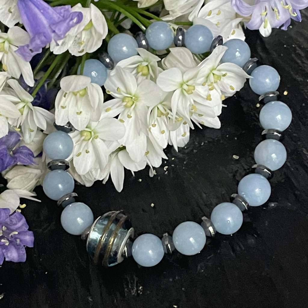 Bracelet de célestite en perles de 8 mm, intercalée d’hématite, et retenant une perle de type Pandora en argent serti de cristal de Murano.