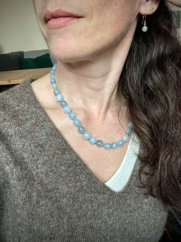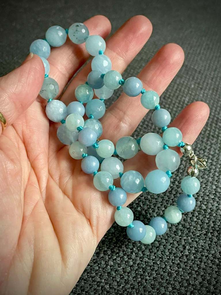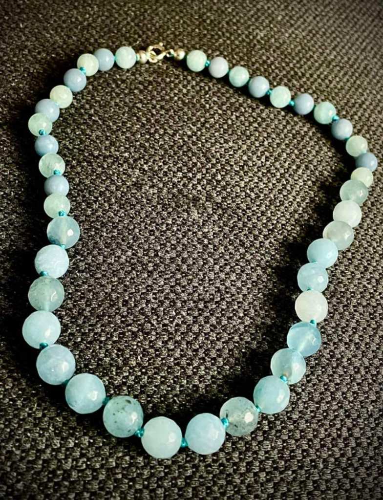Superbe collier entièrement réalisé dans les tons bleus : tous les camaïeux de la mer et du ciel ! De la célestite, de l’aigue-marine ronde en 8 mm, mais aussi en larges perles facettées de 10 mm ! Beaucoup de douceur, de délicatesse pour ce collier de perles connues pour leurs vertus d’apaisement, de sérénité, de calme, et de dialogue. Un bijou spécial, entièrement noué à la main entre chaque perles. Très beau collier, souple et confortable à porter.