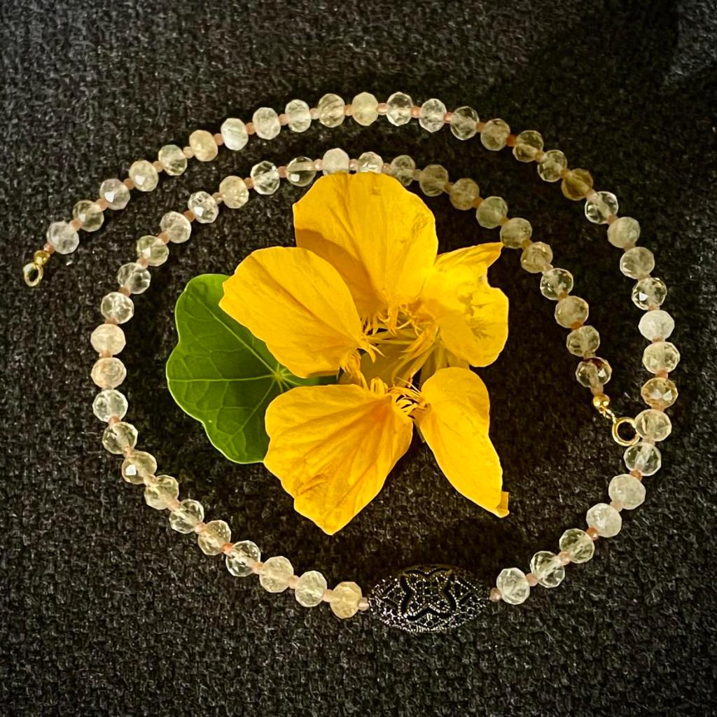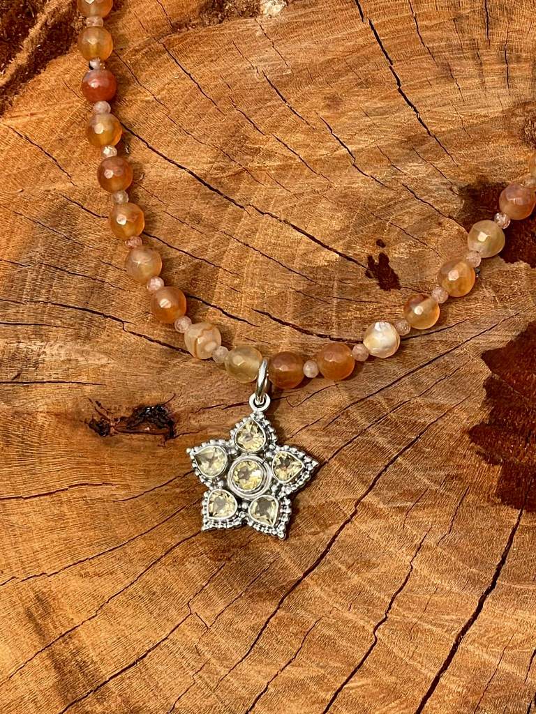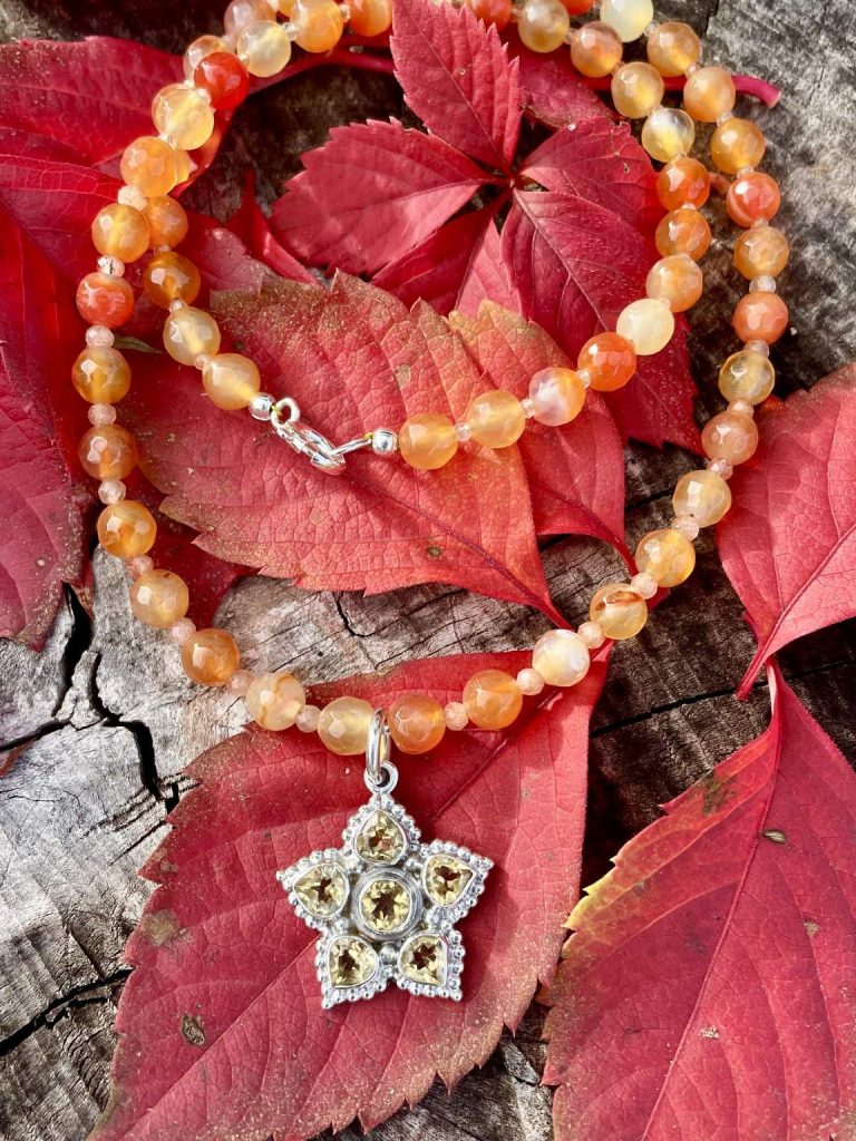 Lorsque la nuit s’efface et que les premières lueurs caressent l’horizon, naît « Au point du jour ». Un collier vibrant de douceur et d’énergie, où des perles facettées de cornaline retiennent un splendide pendentif de citrines serties sur une fleur d’argent massif. S’y ajoute une touche de pierre de soleil pour les perles intercalaires, le tout dans une belle harmonie automnale.