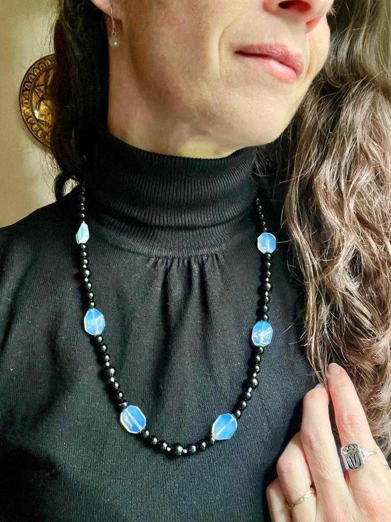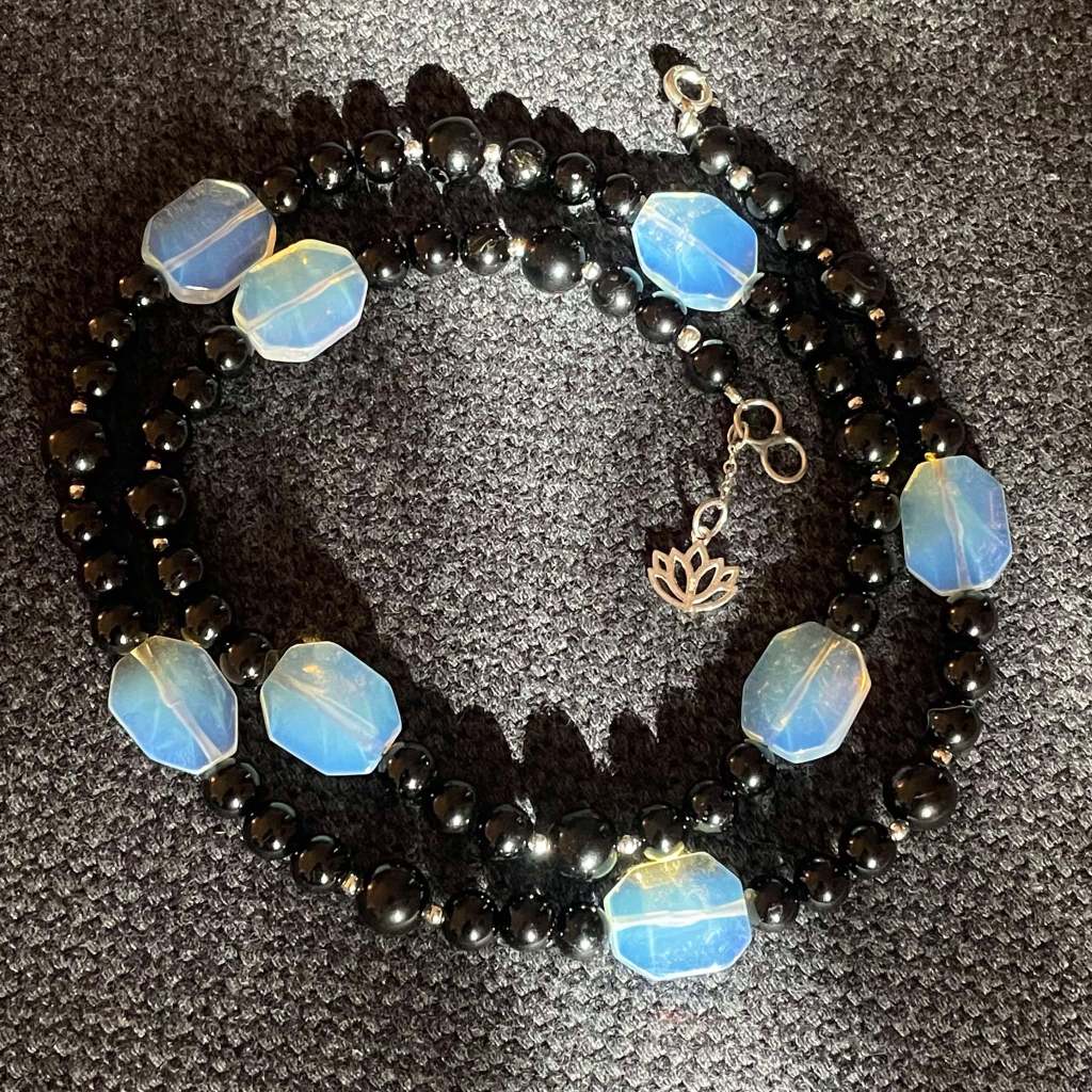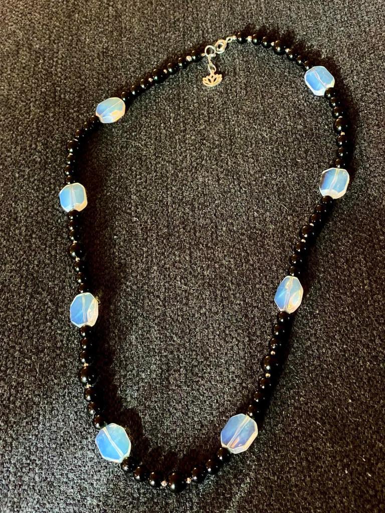 Superbe et long collier de style art deco, enfilé de perles alternées de tourmaline noire, d’argent et d’opaline blanche facettée. Côté vertus, la tourmaline est bien connue des amateurs et lithothérapeutes pour ses propriétés d’ancrage et de protection. C’est une pierre très efficace aux énergies reconnues et très douces à la fois.