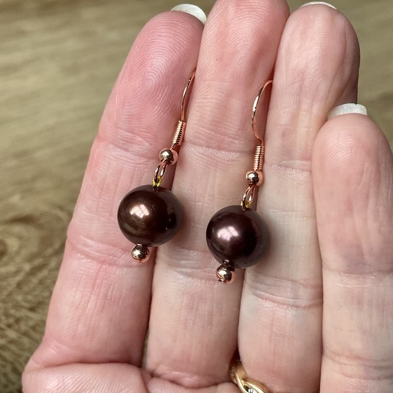 Paire de boucles d’oreilles en vermeil rose : argent 925 plaqué or rose, retenant deux splendides perles de culture chocolat. Crochets poinçonnés. Très jolies perles d’eau douce baroques à la couleur rare et à l’orient cuivré.