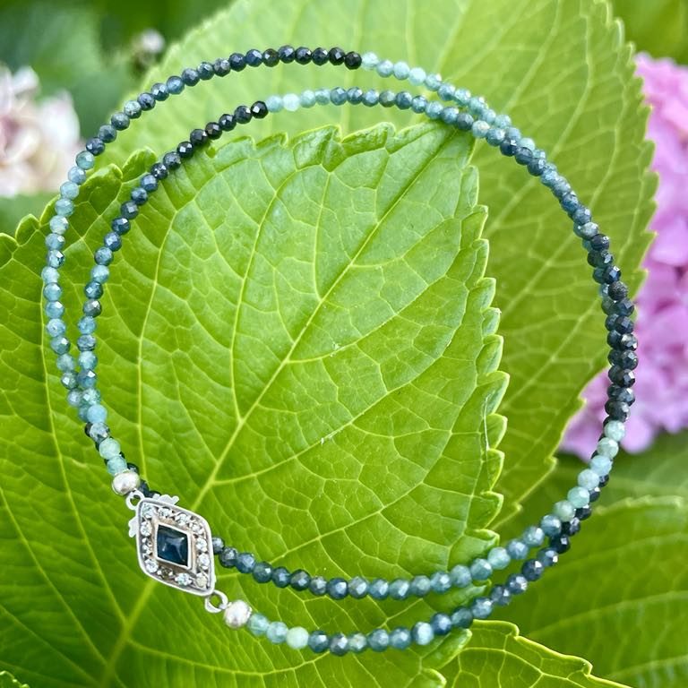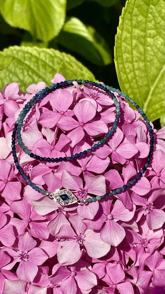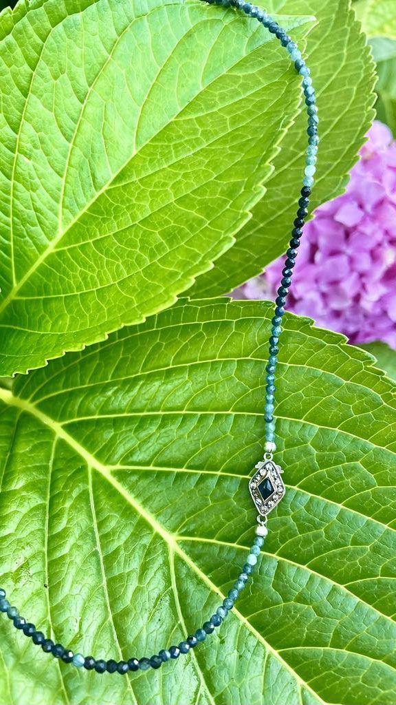 Collier de perles de tourmalines bleues et vertes (Indigolites et verdelites) montées en dégradé sur fil câblé et clôt par un fermoir en argent 925 art deco centré d’un saphir entouré de pierres blanches.