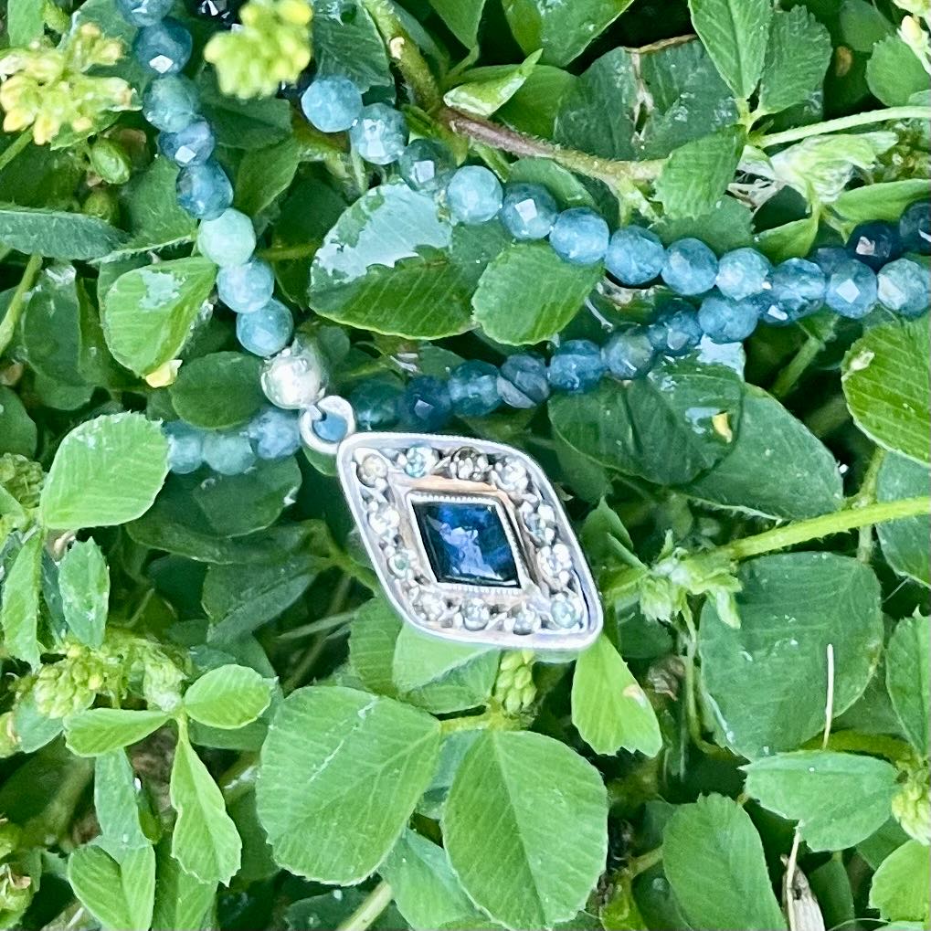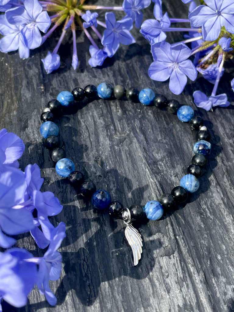 Superbe bracelet en argent 925, obsidienne œil céleste et cyanite qui séduit par son mélange de bleu cyan et de noir animé de reflets. Des gemmes brillantes au lustre animé et hypnotique. Idéal pour un travail de « shadow work », furie nocturne appelle à l’introspection et à la décision en conscience. Ce sont des pierres de protection, mais surtout, des énergies par lesquelles on se remet soi-même au centre de nos préoccupations. Attention, l’obsidienne en particulier, est une énergie forte et assez lourde. On la déconseille aux enfants. (Origine Inde et Amérique latine).