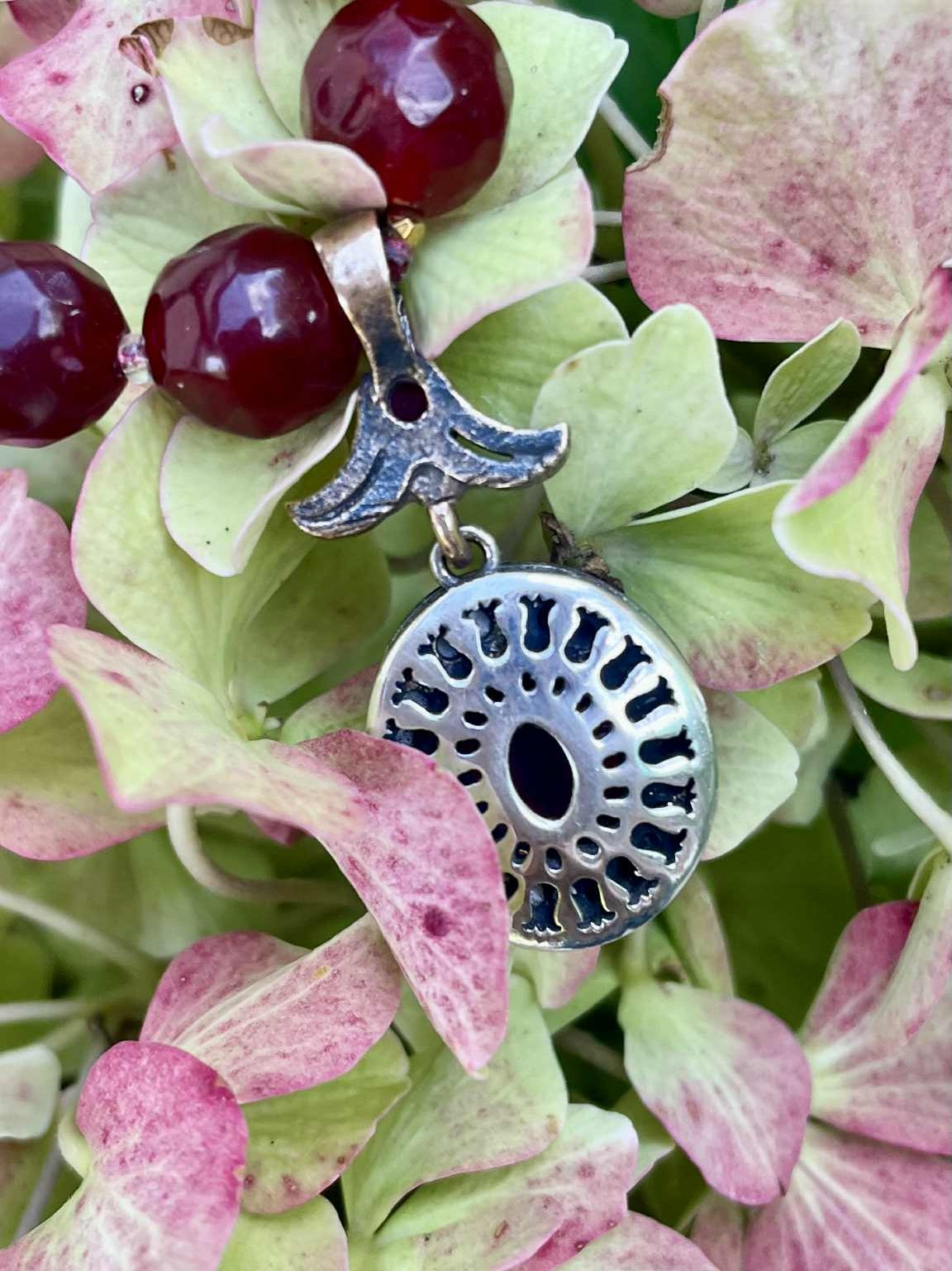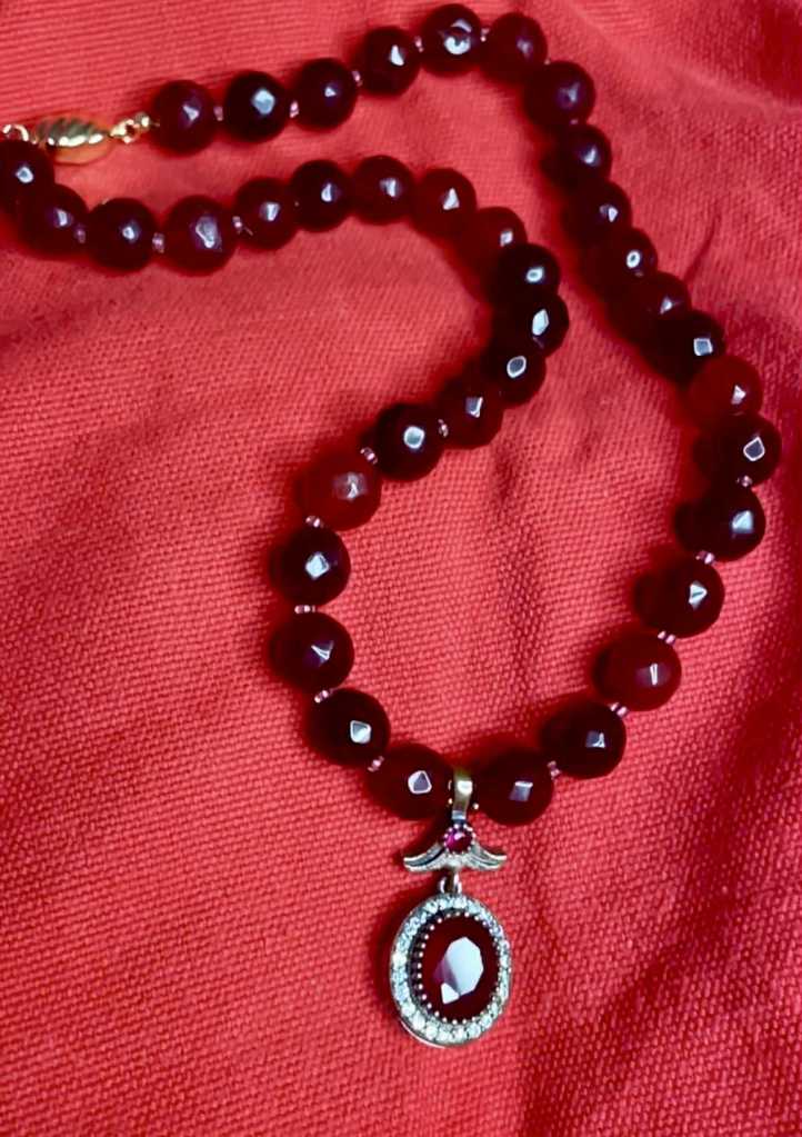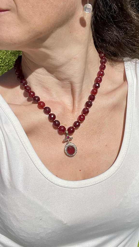 Collier de perles facettées de grenat almandin clôt par un fermoir en argent 925 doré à l’or 18 ct (Vermeil). Le collier retient un superbe pendentif qui mêle argent et cuivre, serti de zircons éclatants et d’un très beau et grand grenat central.
