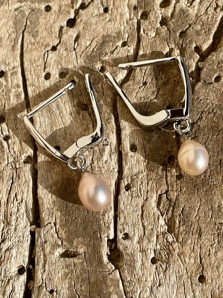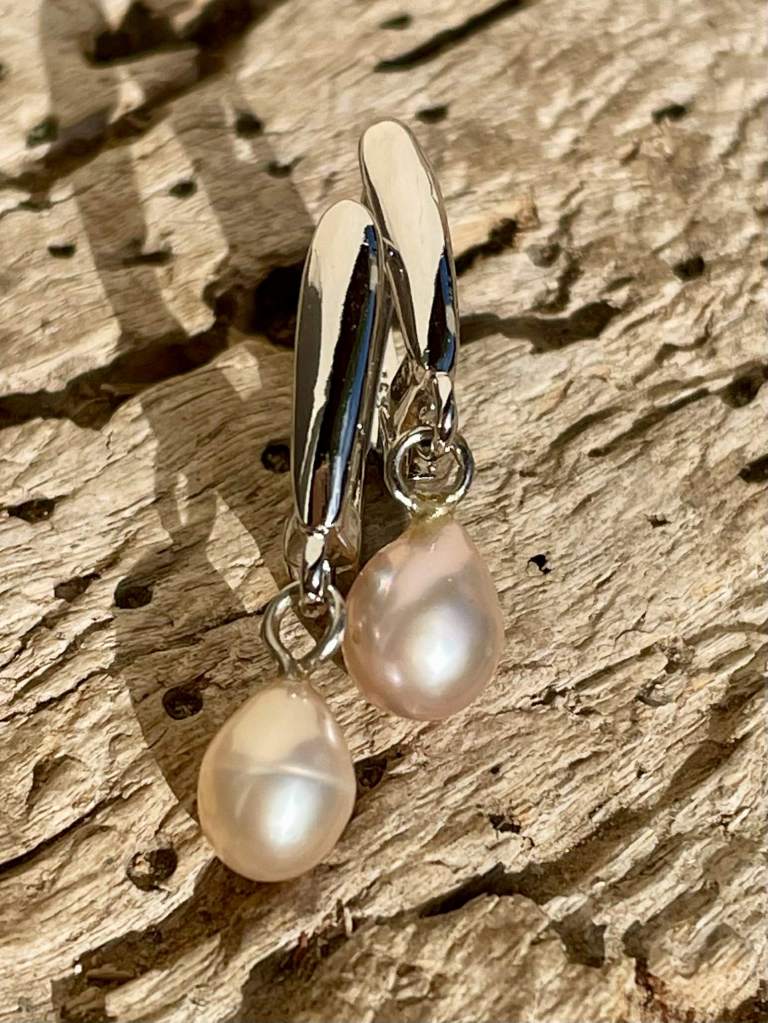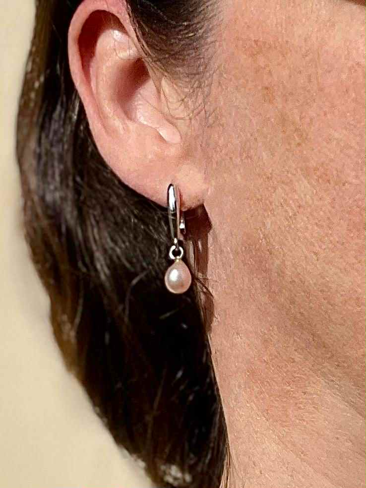 Paire de boucles d’oreilles dormeuses en argent 925, retenant deux splendides perles de culture en goutte légèrement rosées. Crochets poinçonnés, massif et raffinés avec une belle finition rhodiée. Très jolies perles couleur d’aube, parfaitement montée sur ces dormeuses confortables et sécurisées.