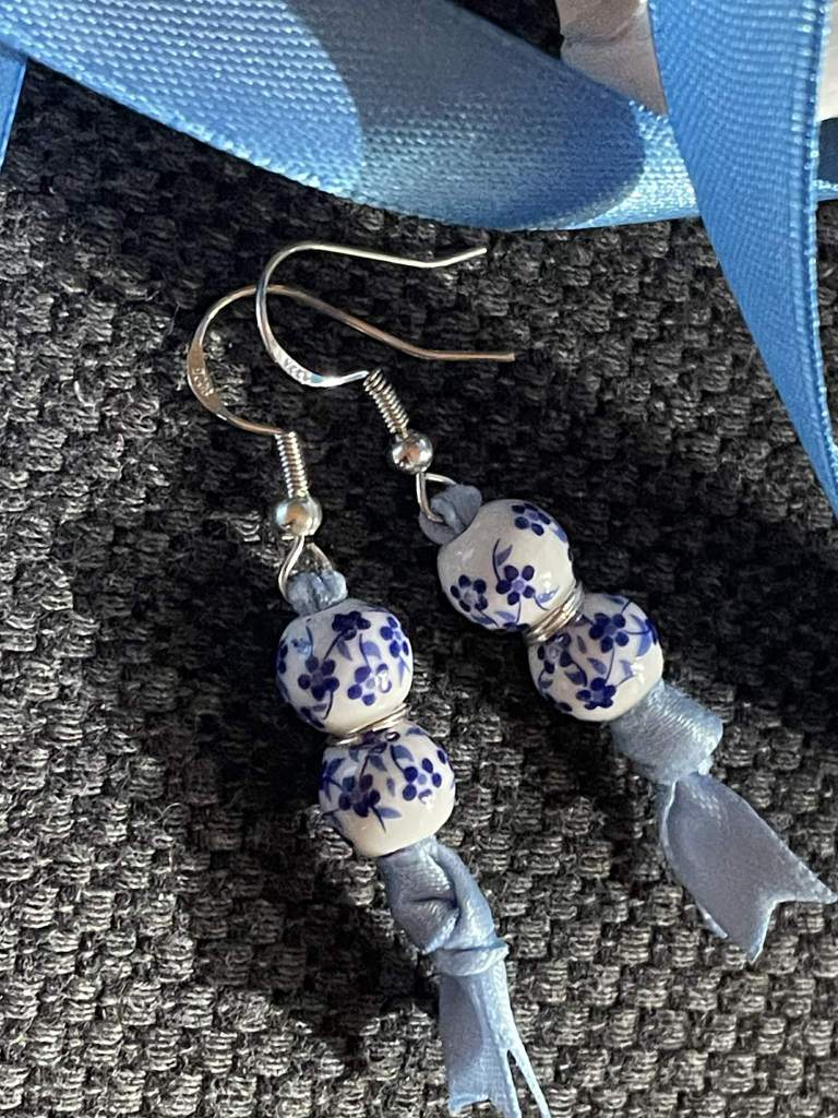 Avec ses perles de porcelaine inspirées par la délicatesse des céramiques anciennes, les boucles “Sous le Ciel de Delft” célèbrent l’élégance intemporelle du bleu et du blanc. Chaque perle, finement peinte à la main, évoque un fragment de ciel d’été — léger, pur, ponctué de fleurs délicates comme un souffle de vent. Suspendues à un ruban de satin bleu, elles dansent avec la lumière et accompagnent les gestes d’un éclat discret. Alliance subtile entre tradition artisanale et grâce contemporaine, ces boucles d’oreilles apportent une touche de poésie à chaque tenue, du plus simple chemisier à la robe la plus raffinée. Portées, elles racontent une histoire de féminité douce et lumineuse — un hommage à la beauté tranquille des instants suspendus.