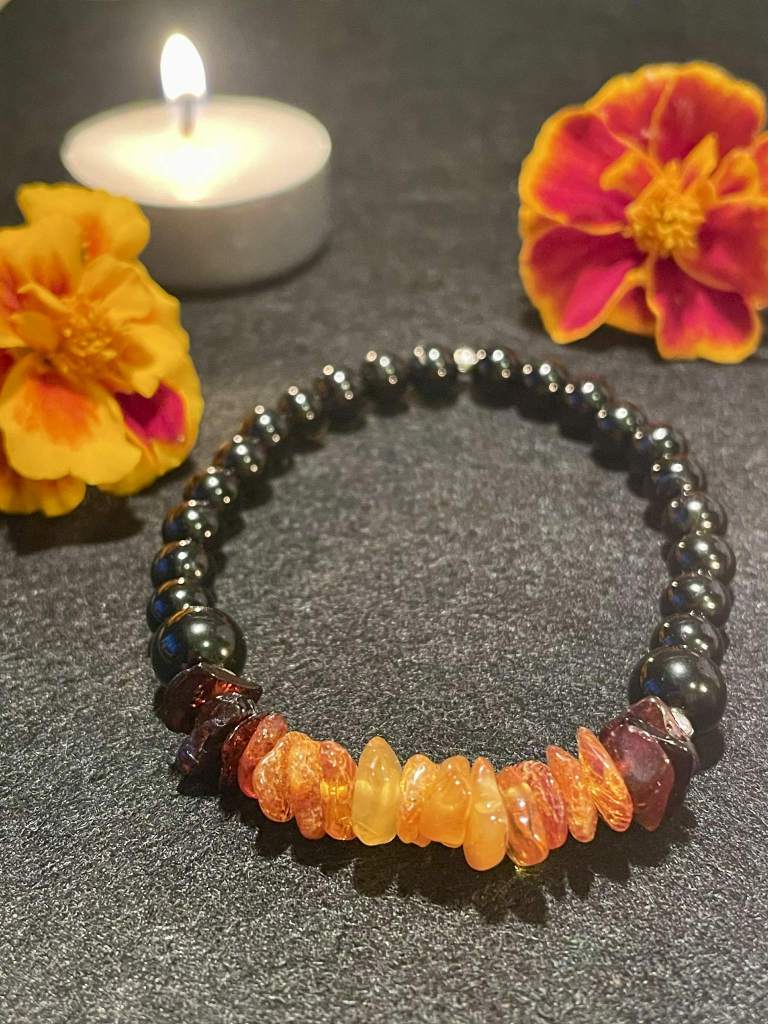 Ce bracelet associe l’énergie solaire de l’ambre, source de joie et de vitalité, à la tourmaline noire, pierre d’ancrage et de protection. Ensemble, elles équilibrent le corps et l’esprit, renforcent la confiance et diffusent une énergie lumineuse et apaisante. Un bijou unique pour rayonner chaque jour.