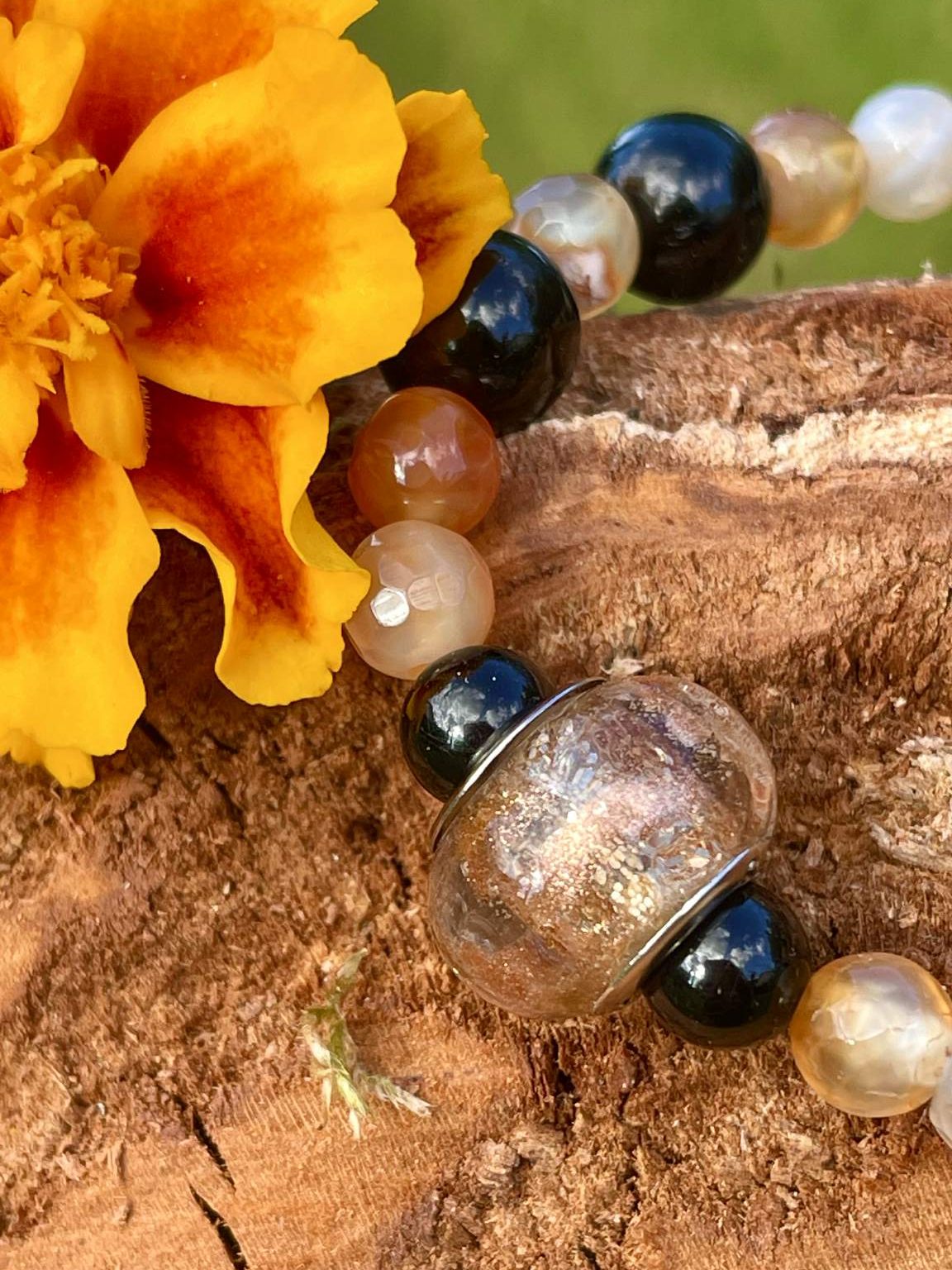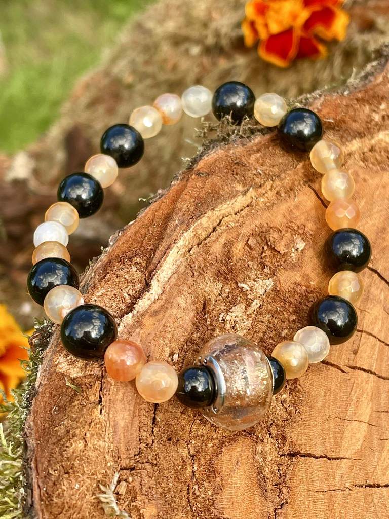 Élégant, lumineux et plein de caractère, ce bracelet associe une superbe perle en cristal de Murano, à la chaleur de la cornaline et à la protection puissante de l’obsidienne pour un équilibre parfait entre énergie et style !