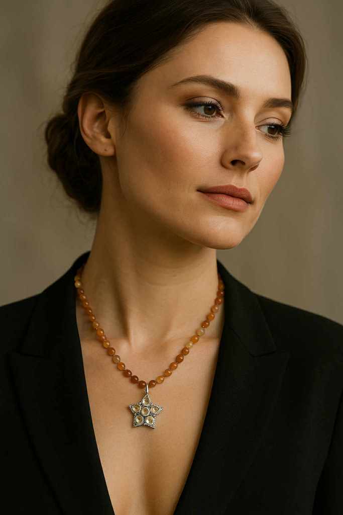 Chaque perle, soigneusement choisie pour sa teinte et sa transparence, reflète les nuances d’un matin doré : la cornaline réchauffe l’âme de son éclat, tandis que la citrine du pendentif diffuse une lumière claire et joyeuse.