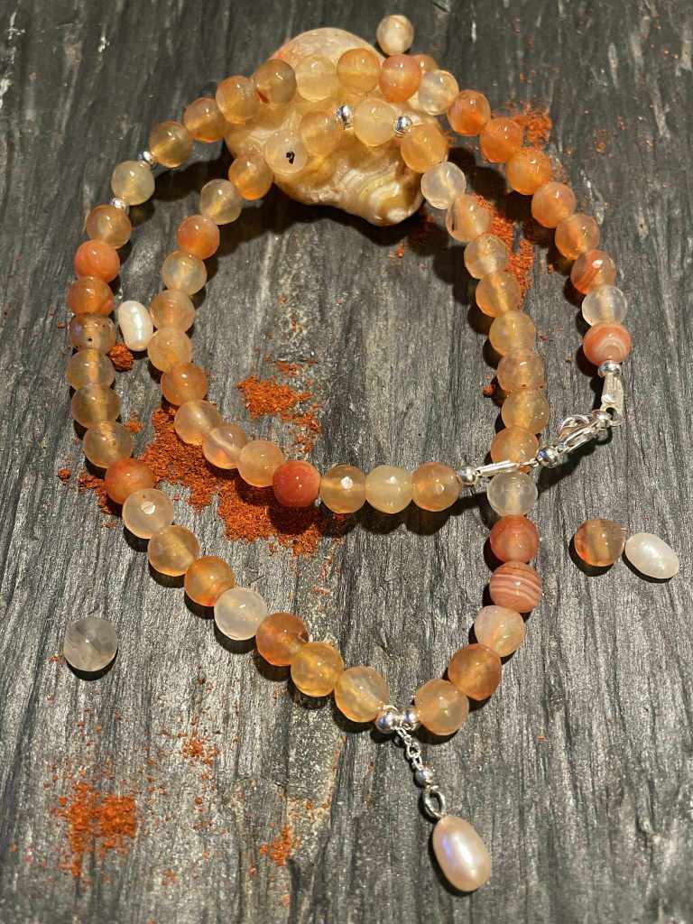 Très joli collier de cornaline facettée aux couleurs d’automne, évoquant la douceur et la chaleur d’un été indien et du soleil. Il retient une perle de culture au bout d’une fine chaine d’argent.