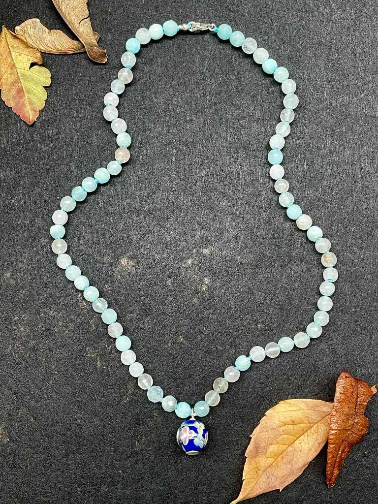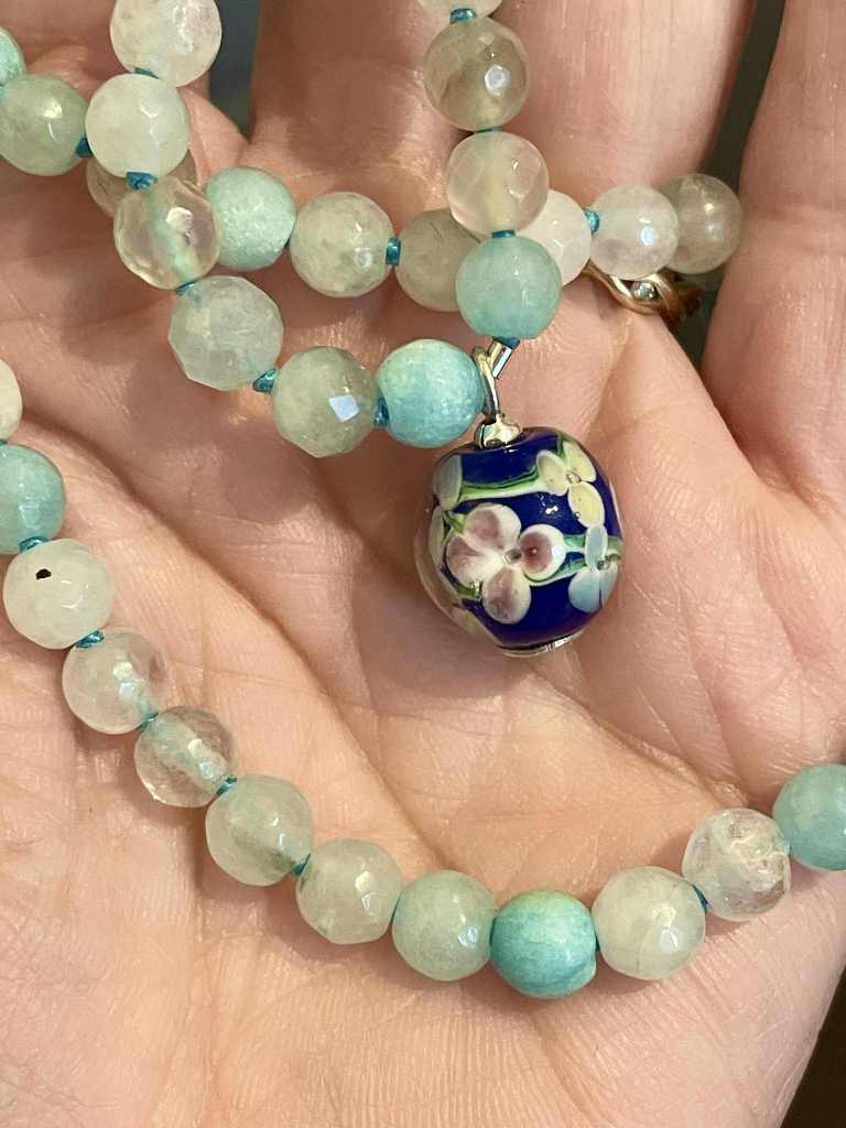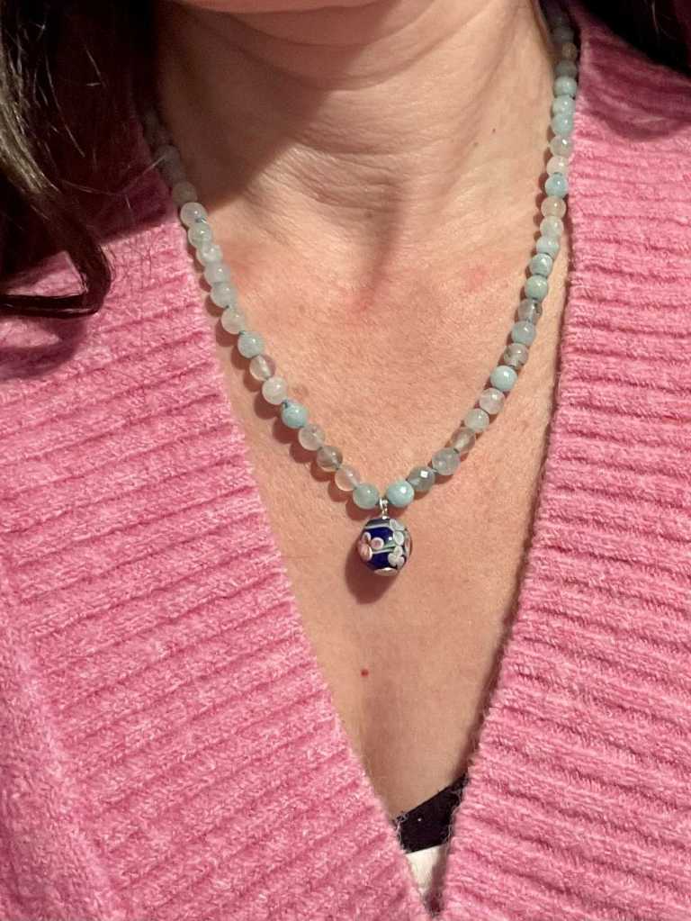 Sublimez votre style avec ce collier unique en perles naturelles d’aigues-marines et de calcite bleue, orné d’un pendentif artisanal en verre de Murano. Chaque perle, soigneusement sélectionnée, reflète des nuances douces de bleu et de blanc, évoquant la pureté de l’eau et la sérénité des pierres naturelles. Le pendentif central, est une authentique perle de Murano qui dévoile un motif floral délicat sur fond bleu profond — une véritable œuvre d’art miniature. Ce bijou associe la finesse du travail verrier italien à l’énergie apaisante de l’aigue-marine et de la calcite bleue.