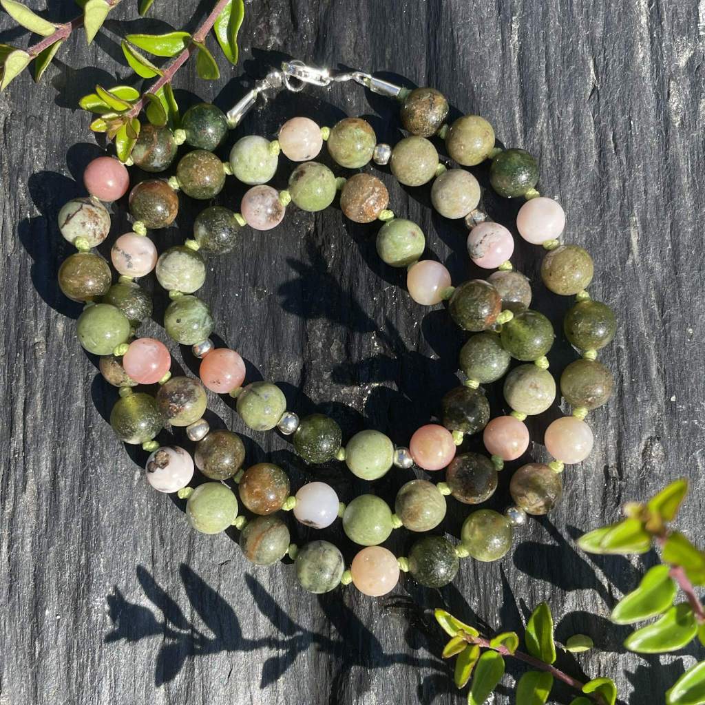 Très beau collier d’opale verte et rose monté sur fil et intercalé d’argent. Le fil est noué entre chaque perle.