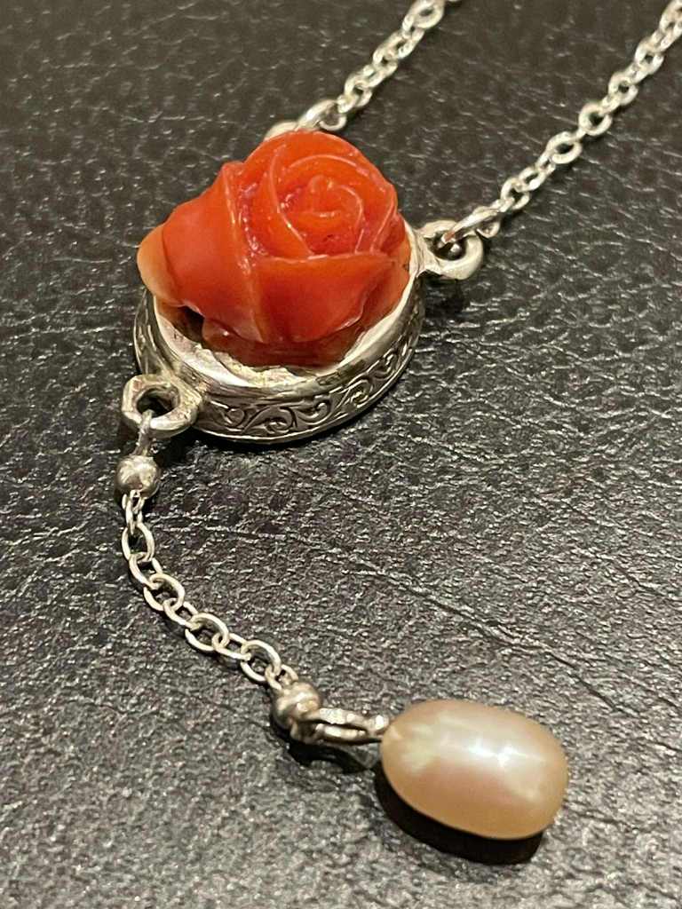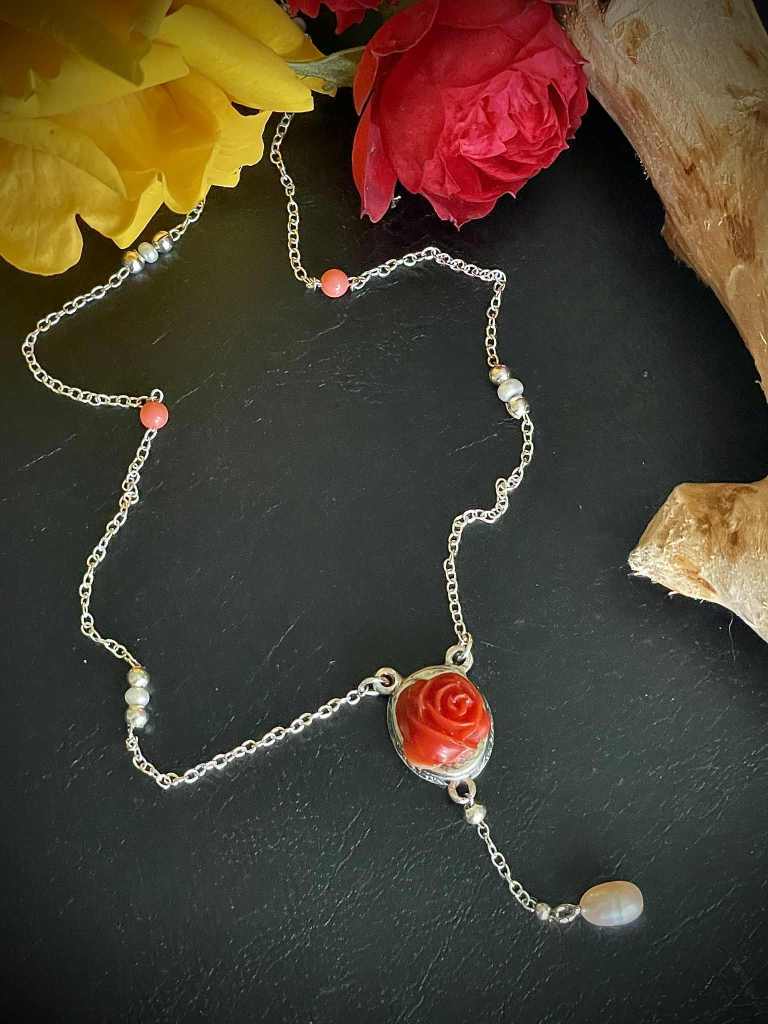 Collier en argent 925 serti de perles d’eau douce et de corail, ce bijou d’inspiration Art Déco se distingue par son médaillon central : un véritable corail sculpté en forme de rose, au travail délicat et raffiné. Une pièce unique qui allie élégance intemporelle et charme artisanal.
