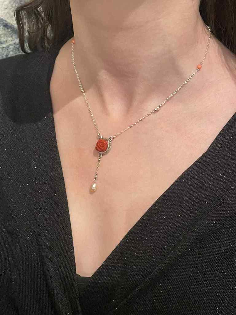Chaque détail a été pensé pour sublimer le décolleté : chaîne fine en argent 925, touches de corail naturel, perles d’eau douce lumineuses et pendentif ancien au style Art Déco revisité. Un collier féminin, original et chargé de caractère, idéal pour apporter une note sophistiquée à toutes vos tenues.