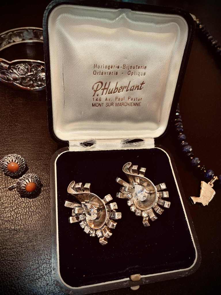 En conclusion, cette paire de boucles d’oreilles est bien plus qu’un simple bijou vintage : elle est le fruit d’une rencontre entre l’ingénierie parisienne de Jacques Lenfant et l’élégance belge de la maison Huberlant. De la subtilité du poinçon au « dé et à l’aile » jusqu’à la technicité du fermoir « Déposé », chaque détail confirme l’authenticité d’une fabrication d’exception des années 1950. Conserver un tel ensemble avec son écrin d’origine est une chance rare, offrant aux collectionneurs un témoignage intact de l’âge d’or de la joaillerie franco-belge. Un véritable trésor de savoir-faire qui traverse le temps sans perdre de son éclat.