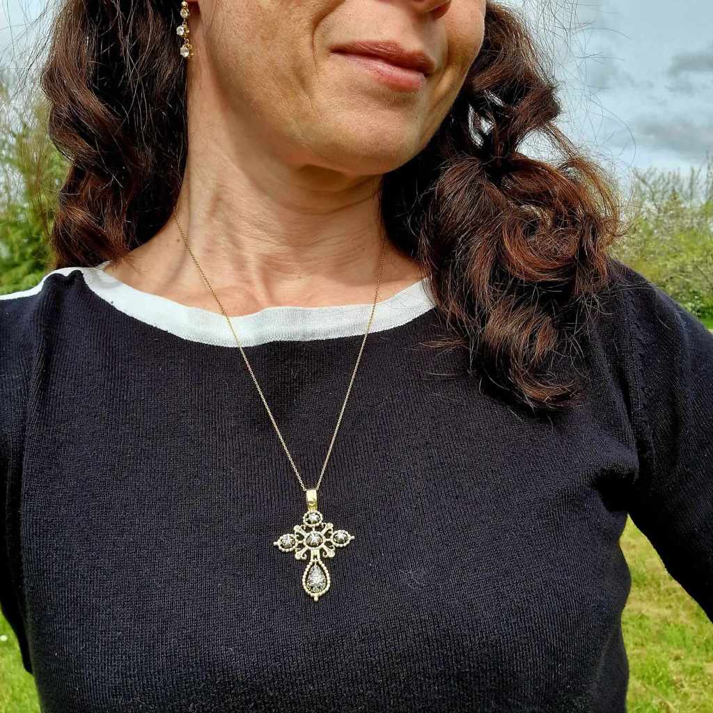 Splendide croix traditionnelle ancienne, en or 18 ct et argent sertie de diamants taille rose. Ce splendide bijou de Provence est une Arlésienne, caractéristique par ses chatons en argent, ses diamants taille rose d’où leur nom de « roses de Provence », son motif rayonnant au centre, sa bélière fixe et sa partie basse mobile. Les diamants sont sertis à fond clos sur orpaillage dans un chaton lui aussi caractéristique, travaillé en rayons dans le fût. Le corps de la croix est réalisé en or jaune, filigrané en perlettes, retenant les chatons de serti en argent.