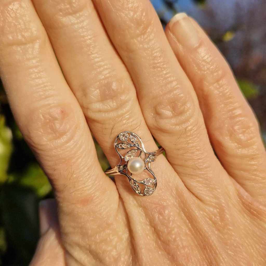 Magnifique bague art nouveau en or blanc 18 ct, rare, toute travaillée de fils d’or parsemés de diamants taille rose et taille ancienne dans un décor feuillagé, centré d’une belle perle de culture. Très beau décor entièrement façonné à la main. Le corps de bague est double : il s’agit du seul et même fil qui s’enroule sur lui-même avant de former la marquise sur laquelle s’appuient les motifs végétaux.