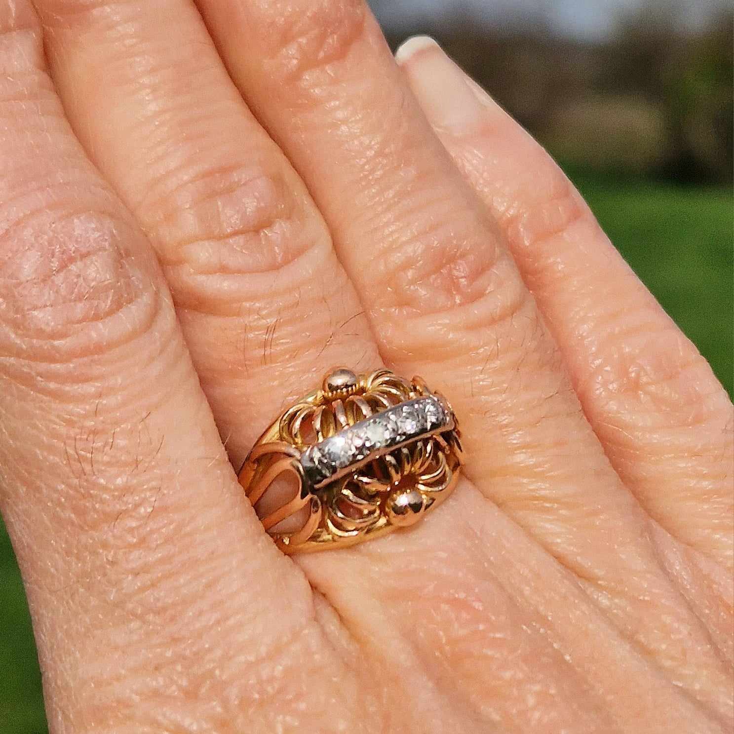 Somptueuse bague dôme entièrement réalisée en dentelle d’or, et centrée d’une barrette de platine sertie de diamants taille brillant ! Ce bijou est une bague de fiançailles réalisée à Paris dans les années cinquante. Le montage, très aérien, est architecturé de ressorts et de fils d’or tissés et retenus ensemble pour former un dôme d’une exceptionnelle finesse et légèreté sur lequel étincellent quatre diamants. Sublime bijou d’exception !