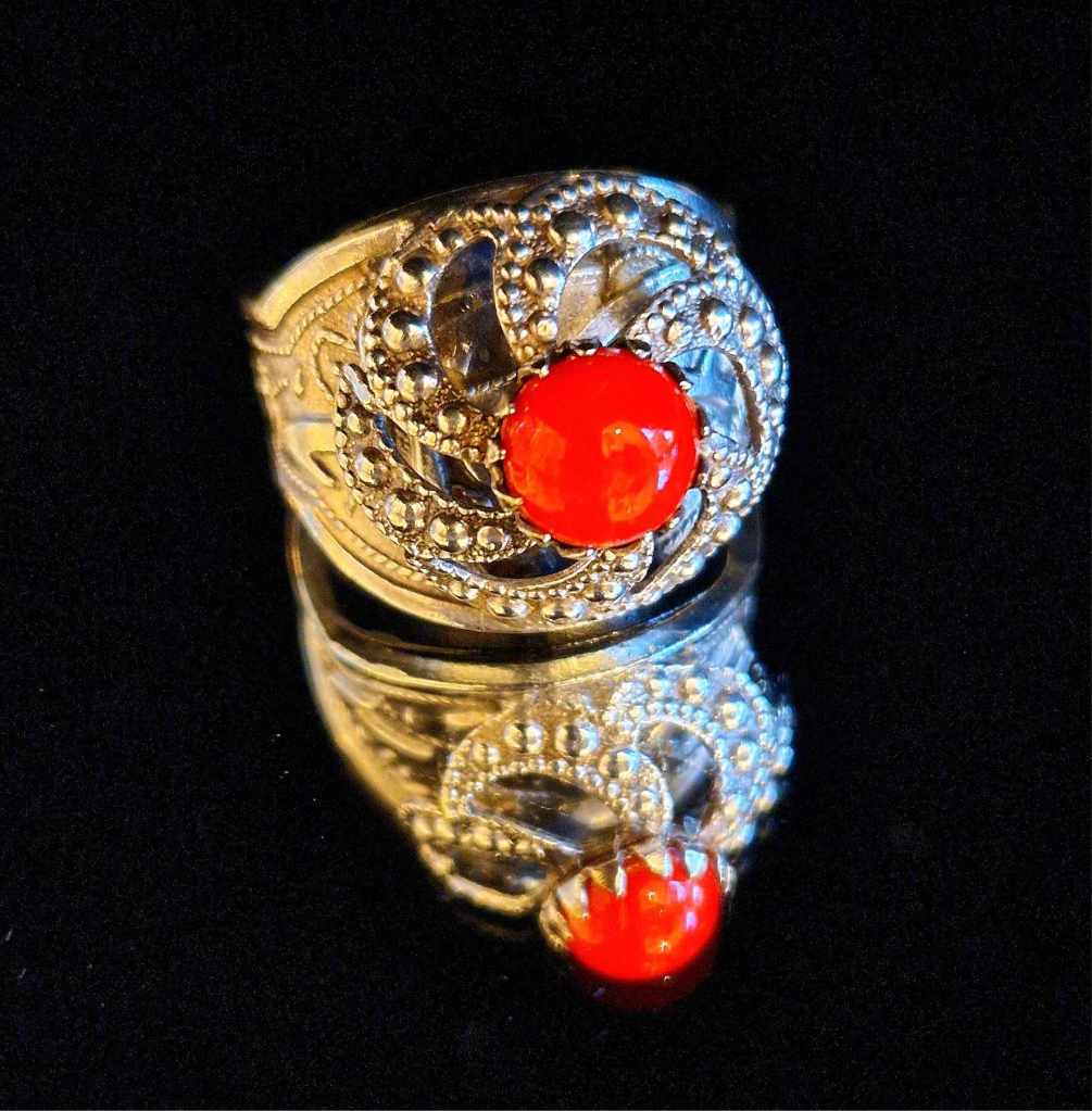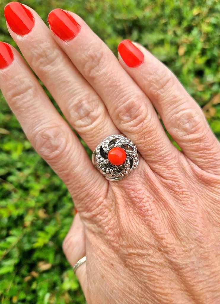 Jolie bague kabyle ancienne en argent 925 poinçonné, ajourée au motif, ornée de calligraphies et centrée d’une perle de corail (Synthétique).