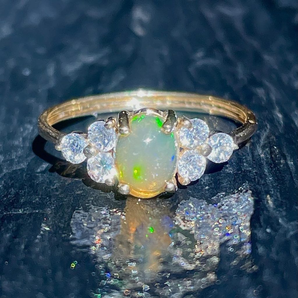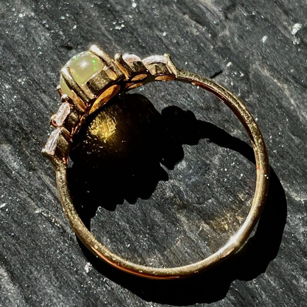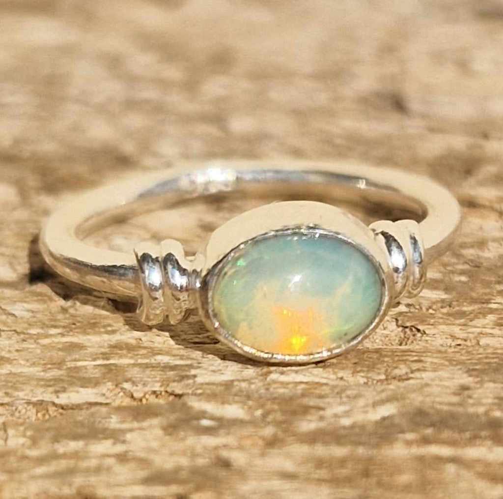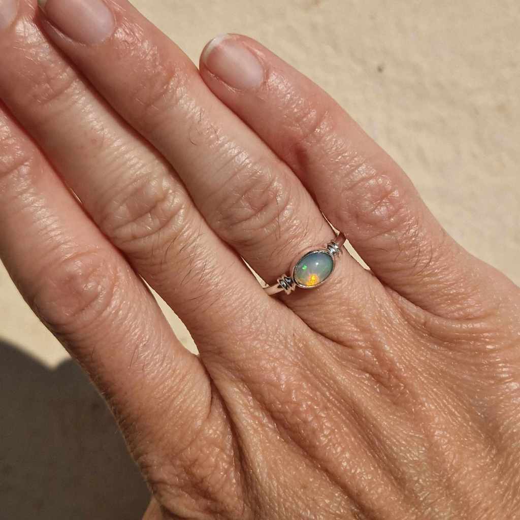 Gracieuse bague en argent 925 sertie d’une belle opale Welo (Éthiopie). L’opale Welo est une pierre relativement magique à plus d’un titre ! Tout d’abord, l’opale Welo est souvent hydrophane. En effet, quand elle est immergée dans l’eau elle peut devenir complètement translucide avec des nuances en aurore, pour retrouver ensuite son aspect initial en séchant. Caractéristique par ses feux glissants, elle peut même, comme celle-ci, revêtir un effet œil de chat sous certains éclairages.