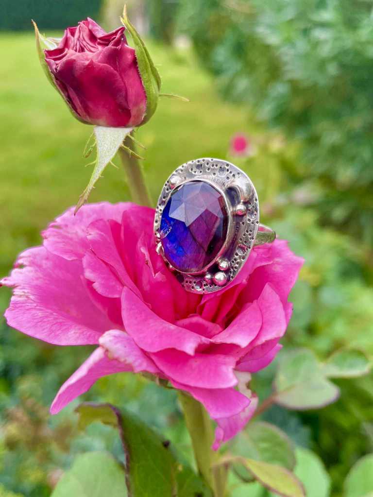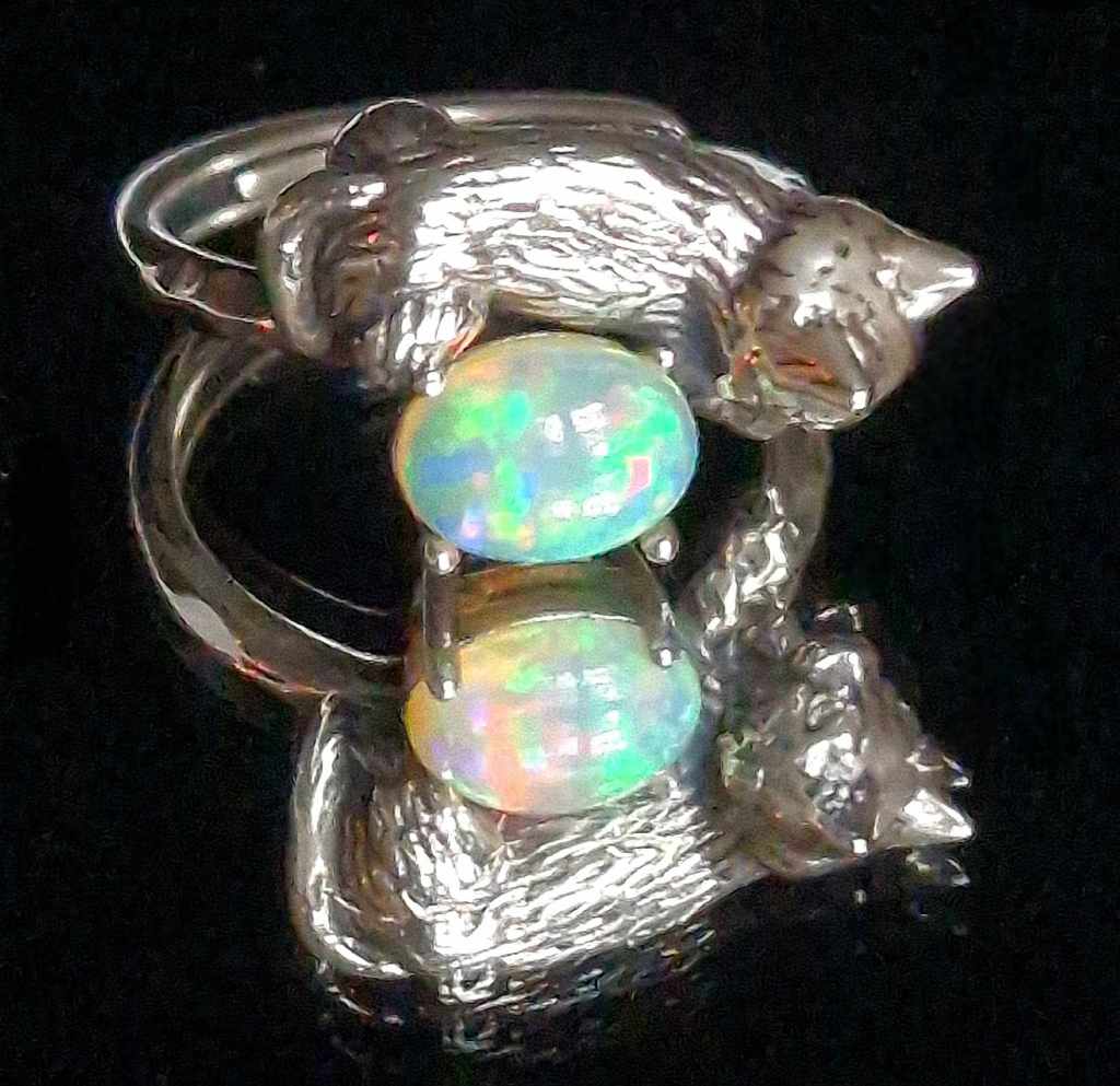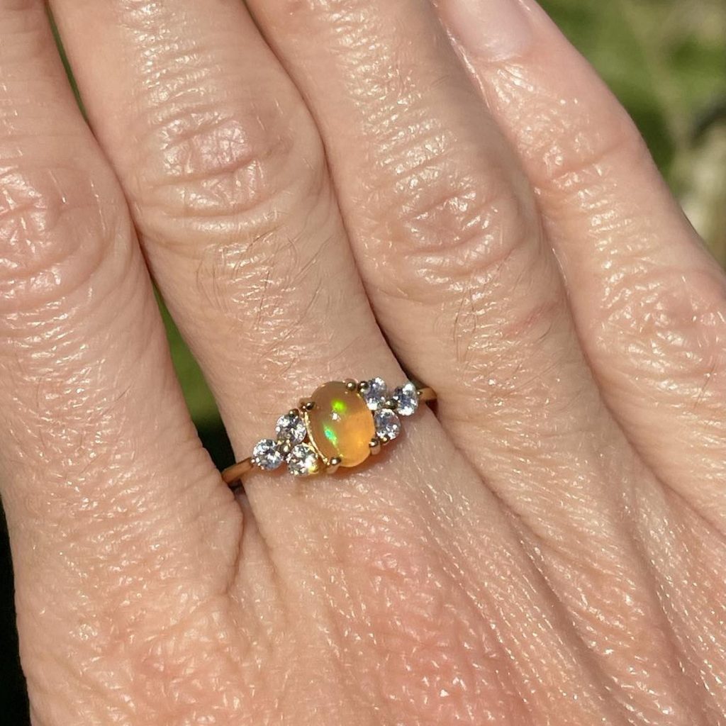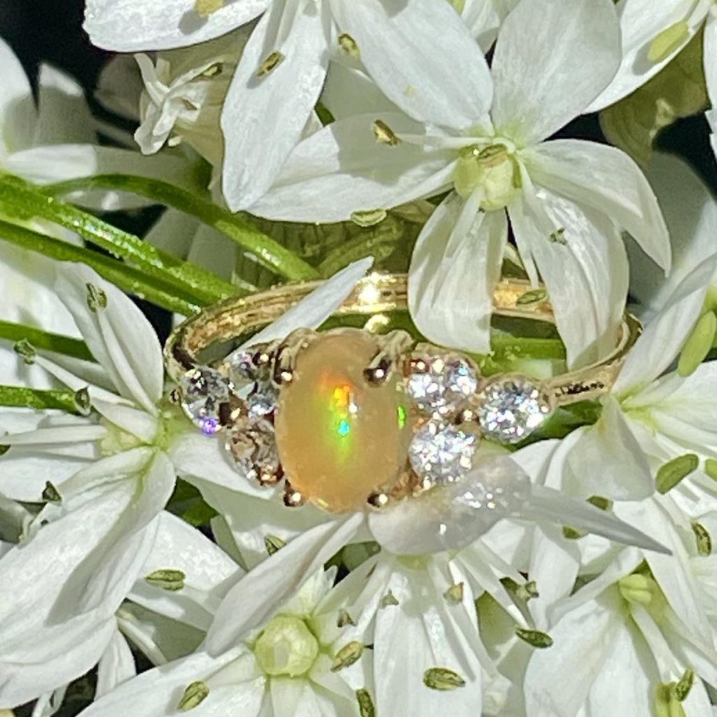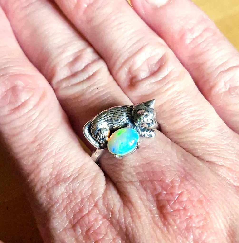 Gracieuse bague en argent 925 sertie d’une belle opale Welo (Éthiopie). L’opale Welo est une pierre relativement magique à plus d’un titre ! Tout d’abord, l’opale Welo est souvent hydrophane. En effet, quand elle est immergée dans l’eau elle peut devenir complètement translucide avec des nuances en aurore, pour retrouver ensuite son aspect initial en séchant. Caractéristique par ses feux glissants, elle peut même, comme celle-ci, revêtir un effet œil de chat sous certains éclairages.