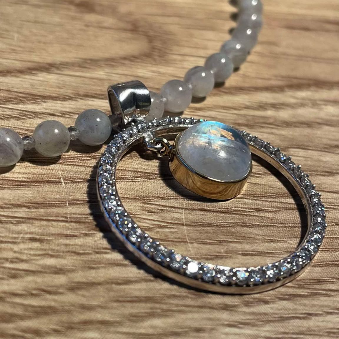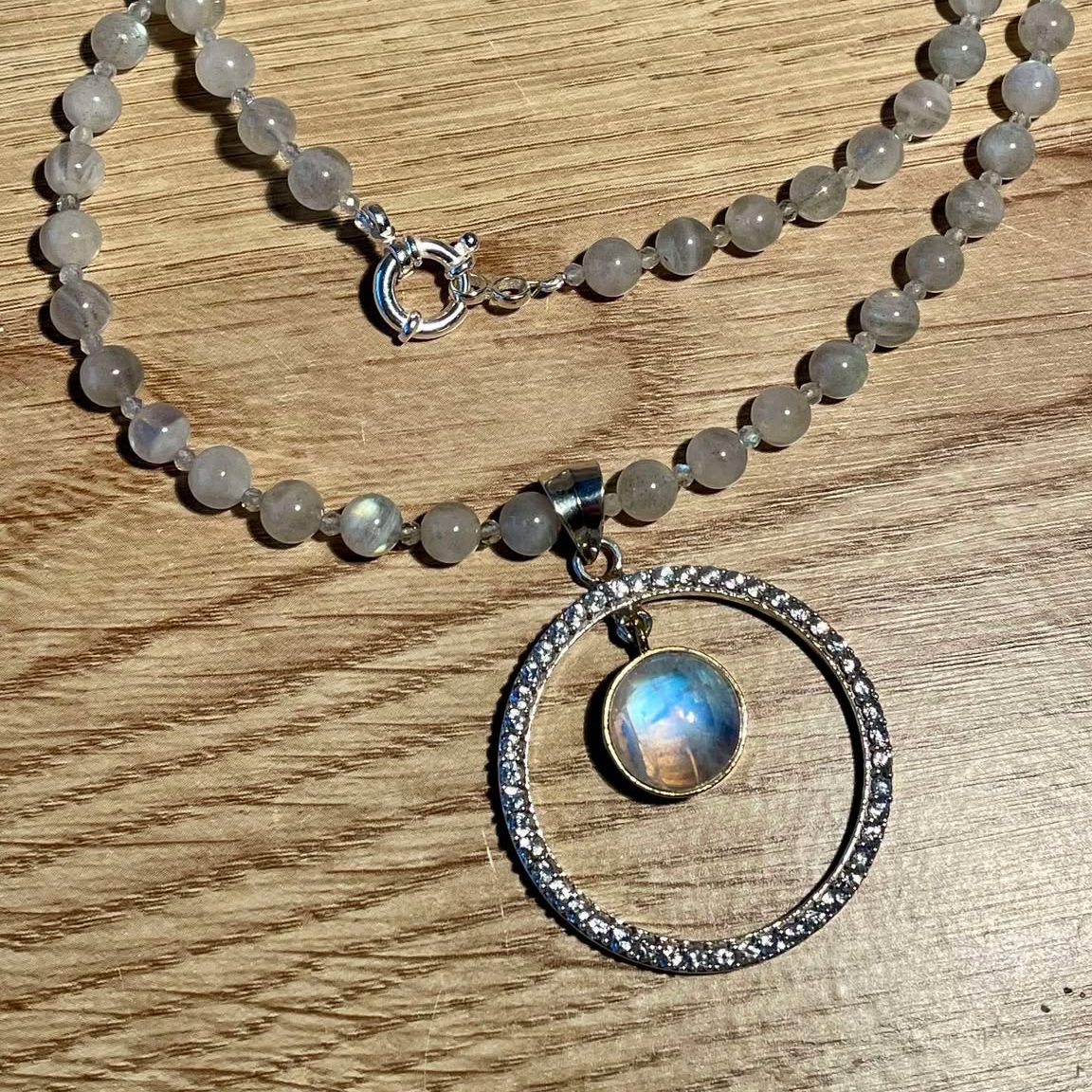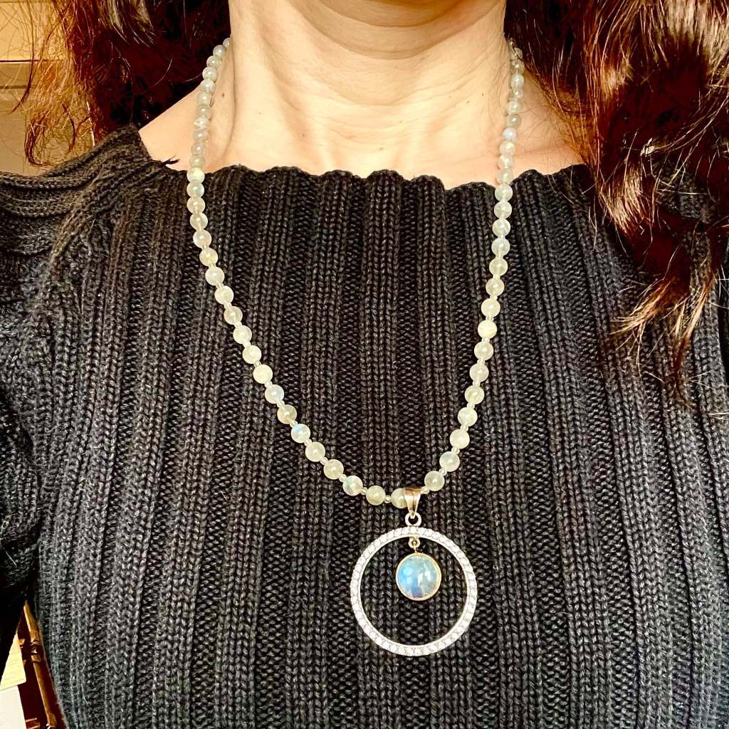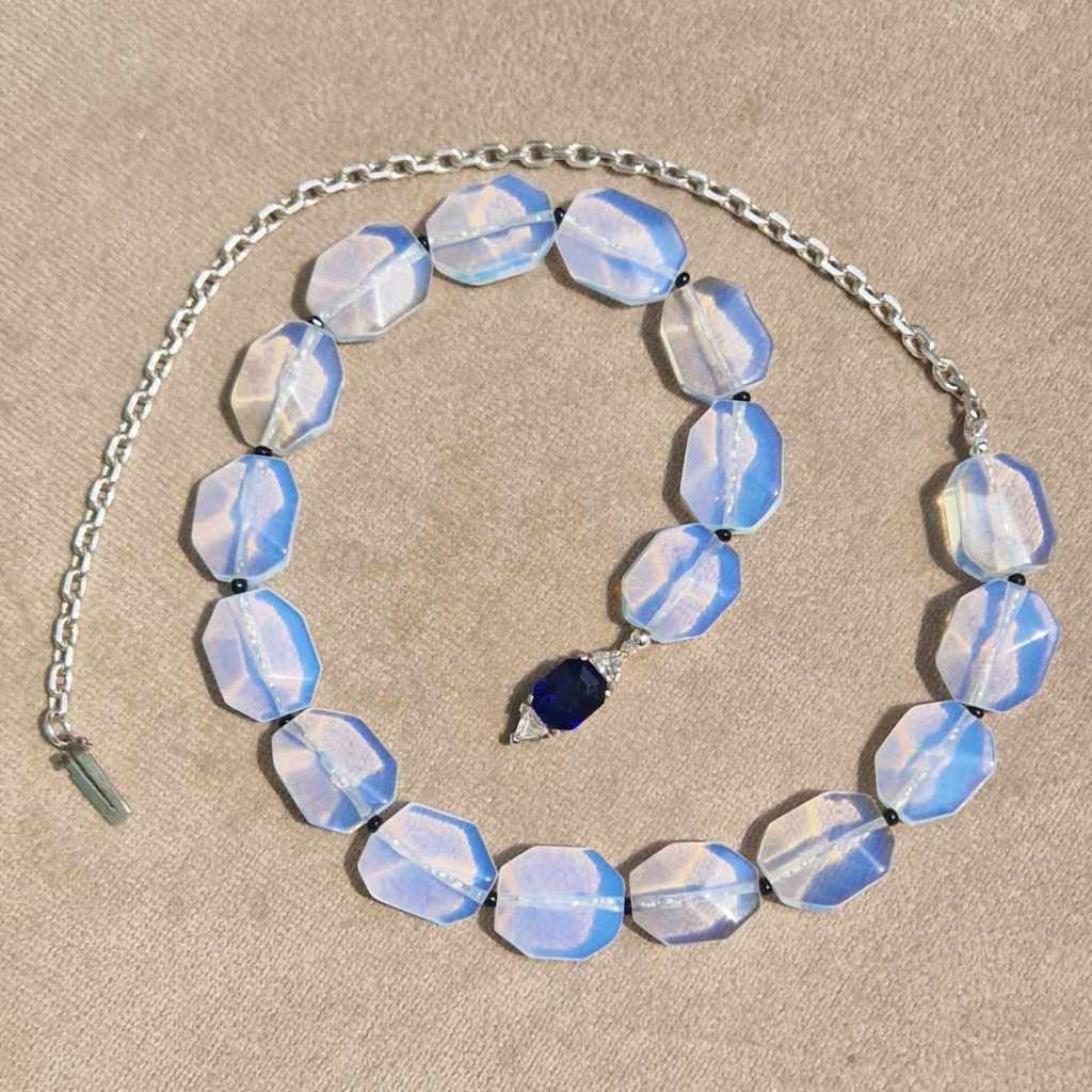 Somptueux collier clôt d’un authentique fermoir ancien des années trente parfaitement fonctionnel, et soutenant une ligne de perles d’opaline retenues par une chaîne d’argent massif 925. Collier remonté intégralement sur fil de soie et d’argent. Beau bijou, pièce unique.