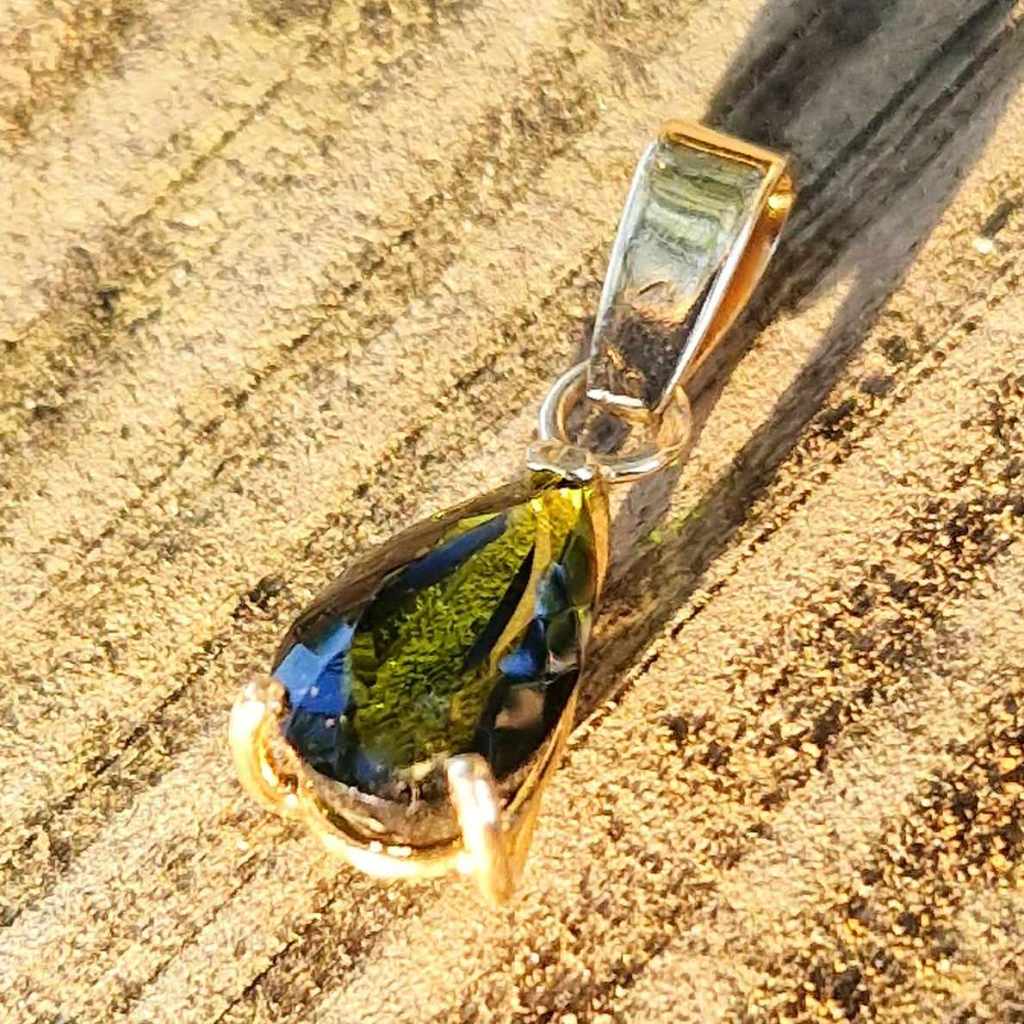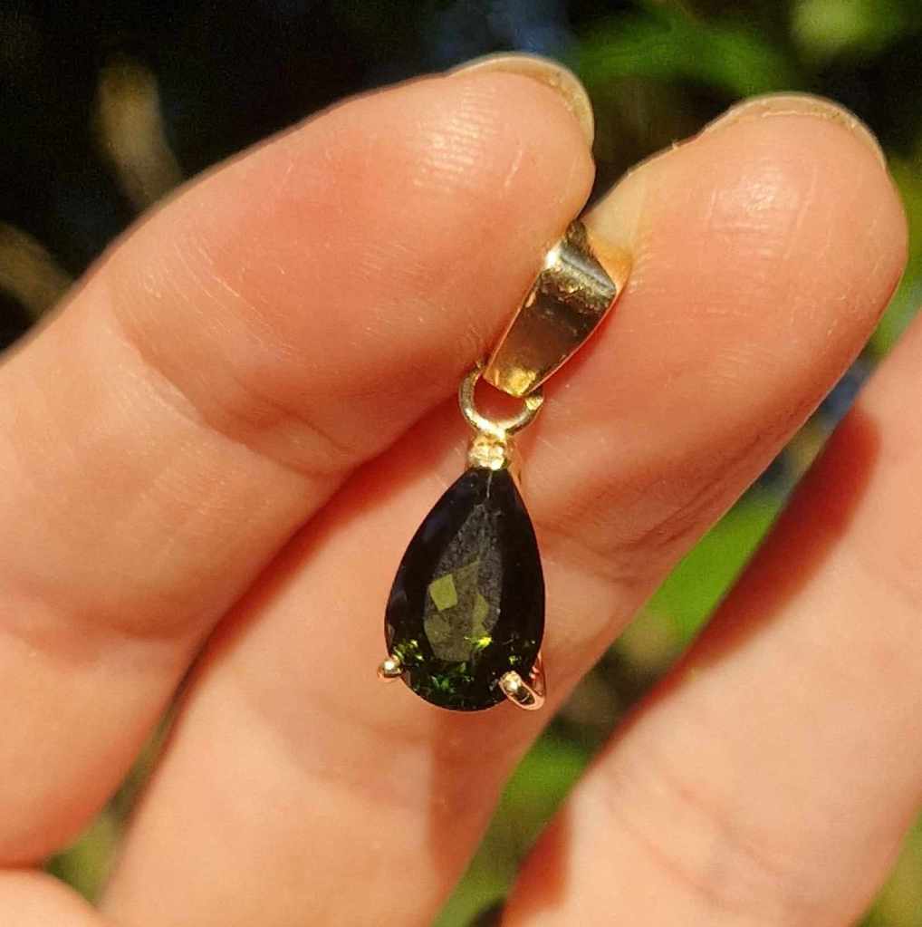 Somptueuse tourmaline verte taillée en poire et sertie sur or 750/°°°. Très belle et rare tourmaline authentique du Mozambique avec un splendide éclat vert olive (Cuivre). Bijou impeccable à l’état de neuf.