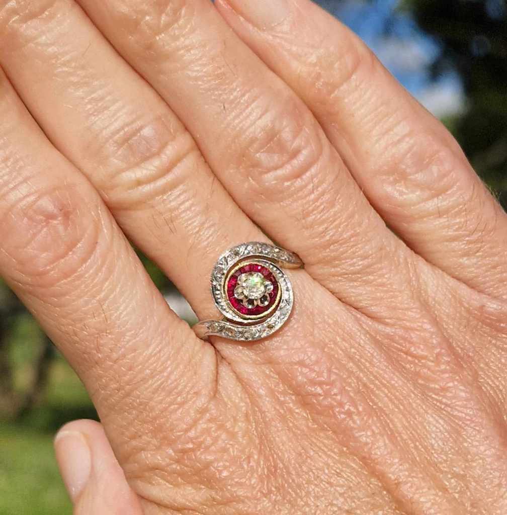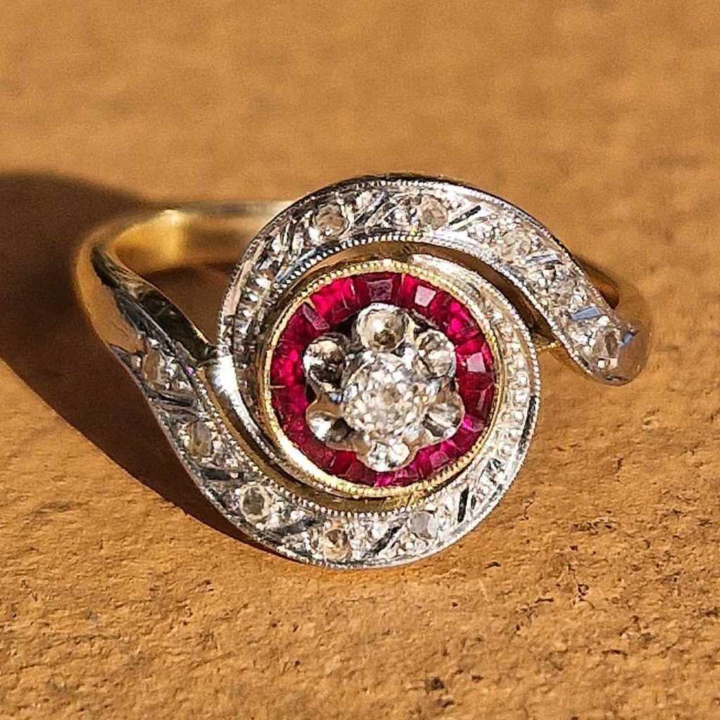 Splendide bague ancienne modèle volute centrée d’un joli diamant taille ancienne, serti à six griffe dans un chaton floral de platine, entouré de rubis calibrés et d’un enroulement de platine pavé de diamants taille rose. Très beau modèle des années 1910 en parfait état !
