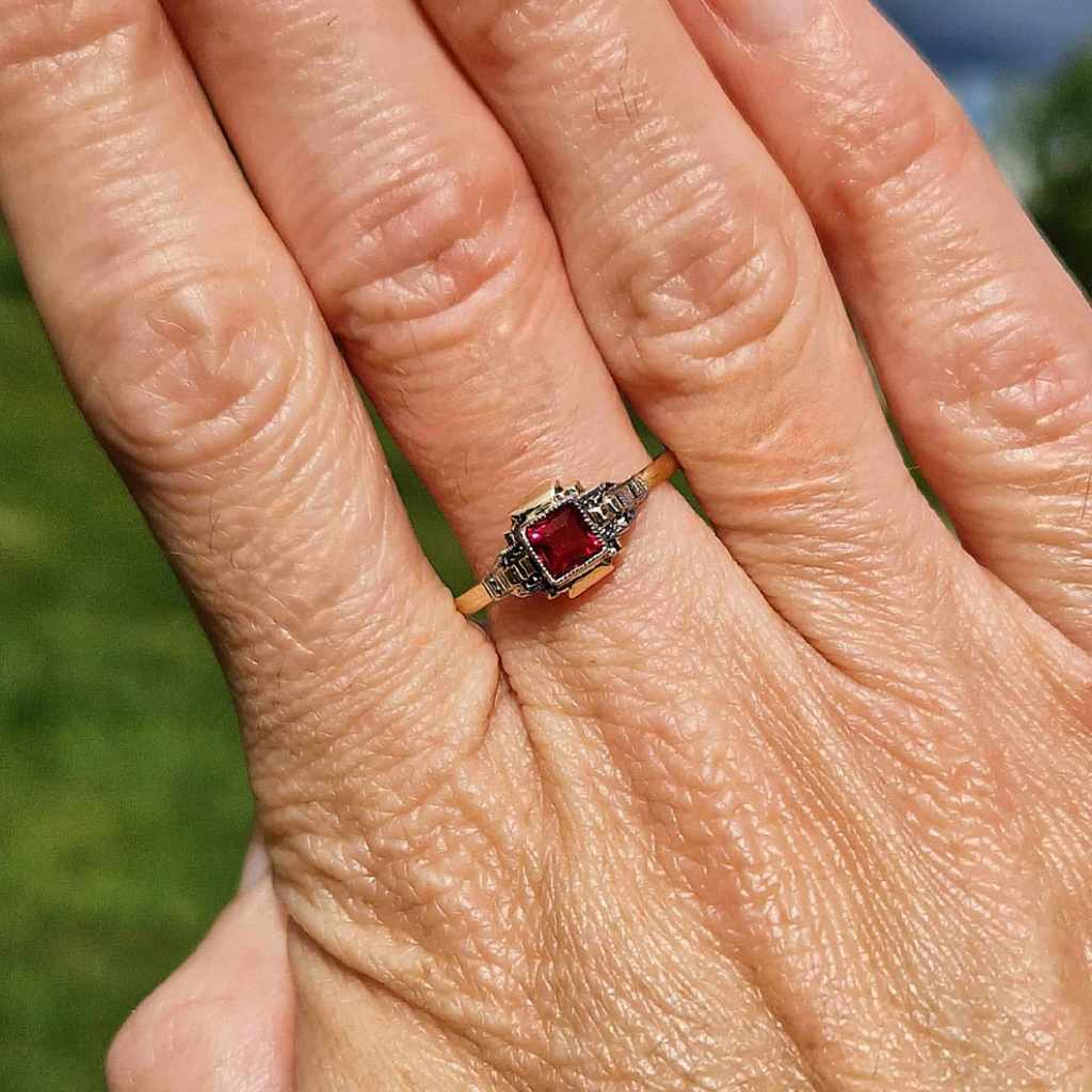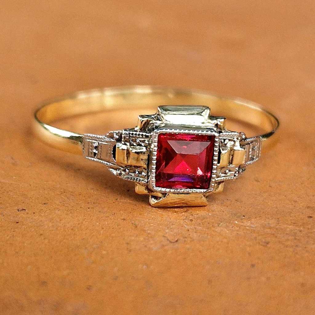 Magnifique bague ancienne époque art deco en or jaune et gris, sertie d’un rubis Verneuil rouge aux nuances et éclats changeants. Très beau et délicat travail art deco aux formes et volumes géométriques distingués. Or repoussé à la main et moulage à la cire traditionnels pour le façonnage de cette bague absolument unique, fine et gracieuse !