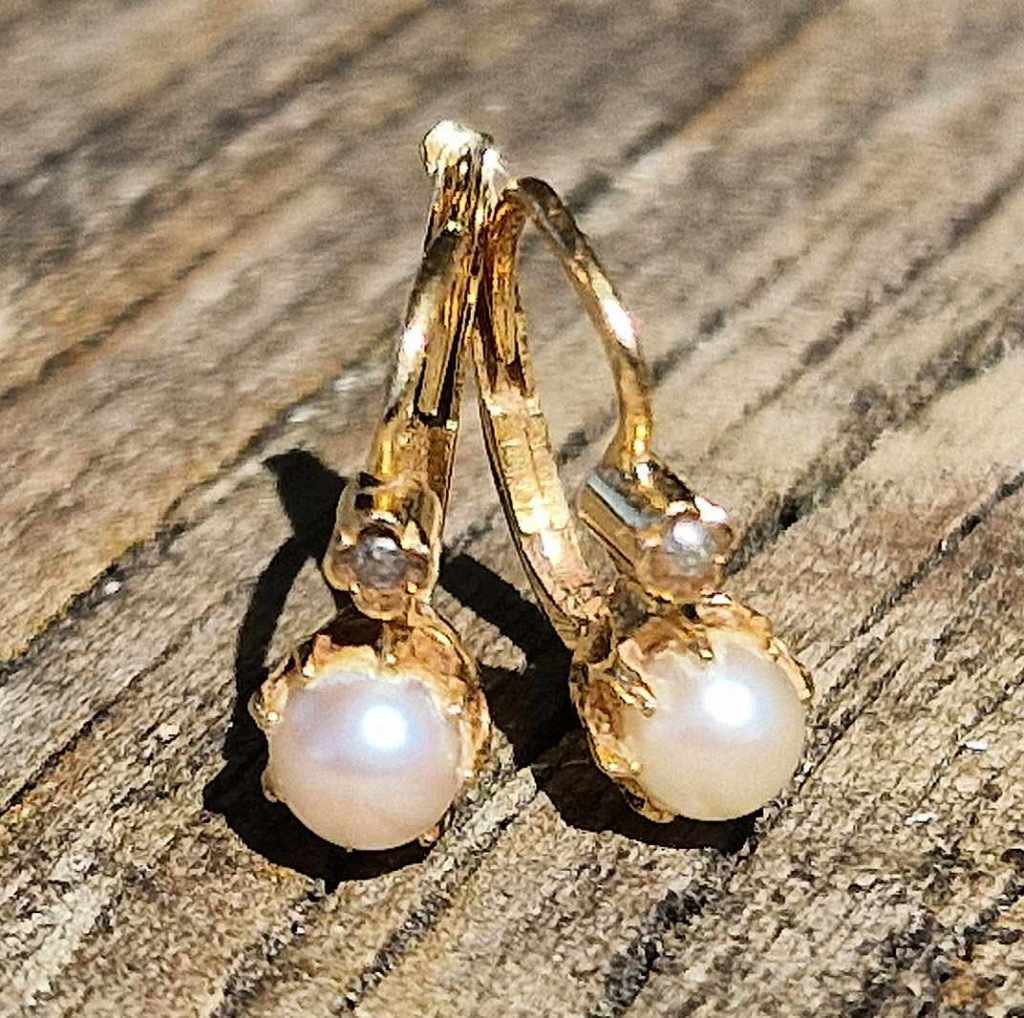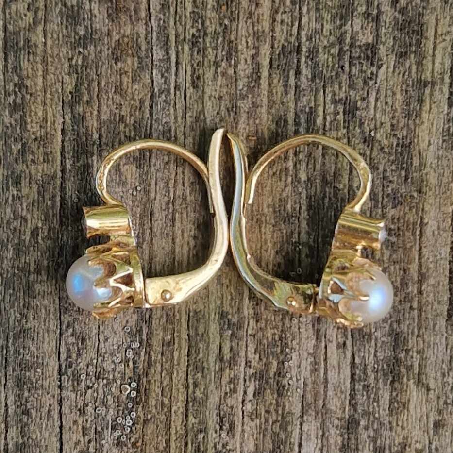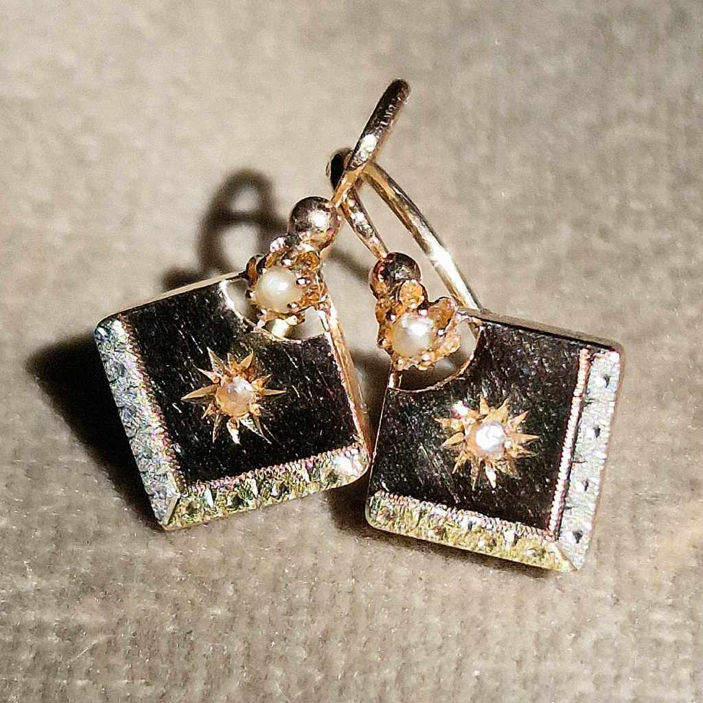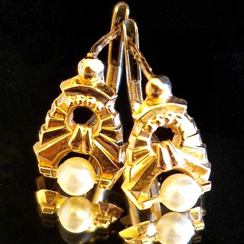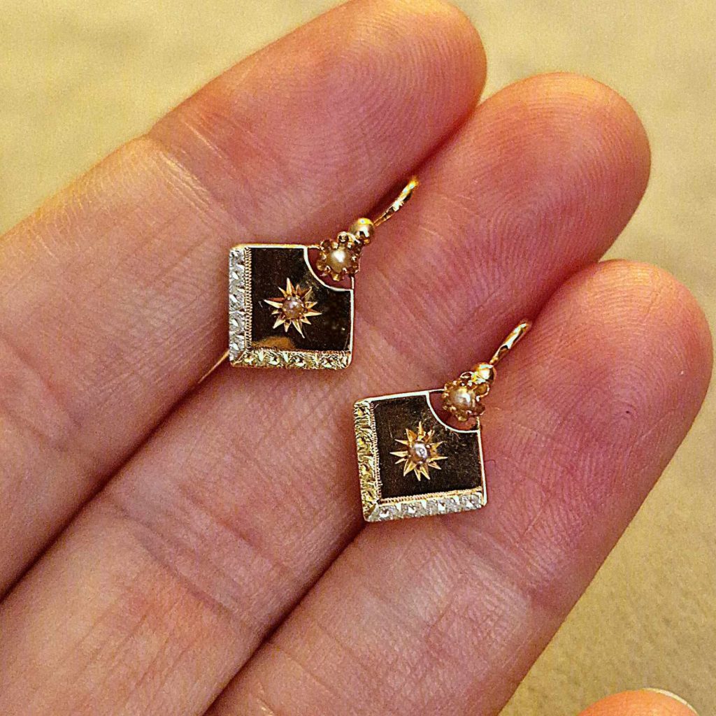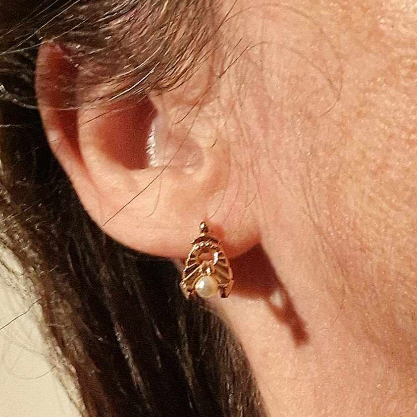 Paire de boucles d’oreilles dormeuses, anciennes, en or jaune 18 cts serties de deux perles fines naturelles. Une plus petite dans un motif fleuri et une plus grande. Fermoir à bascule, en brisure : les dormeuses s’enfilent ici de l’avant vers l’arrière. Il est bien fonctionnel. Bel orient des perles en parfait état, et dont le lustre n’a subi aucune usure. Bijou ancien daté des années 1920 en parfait état !