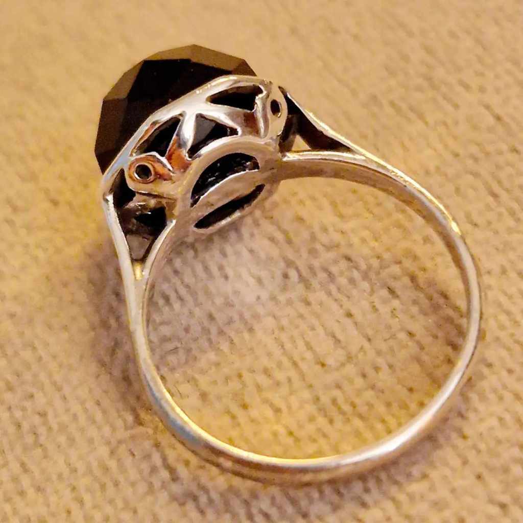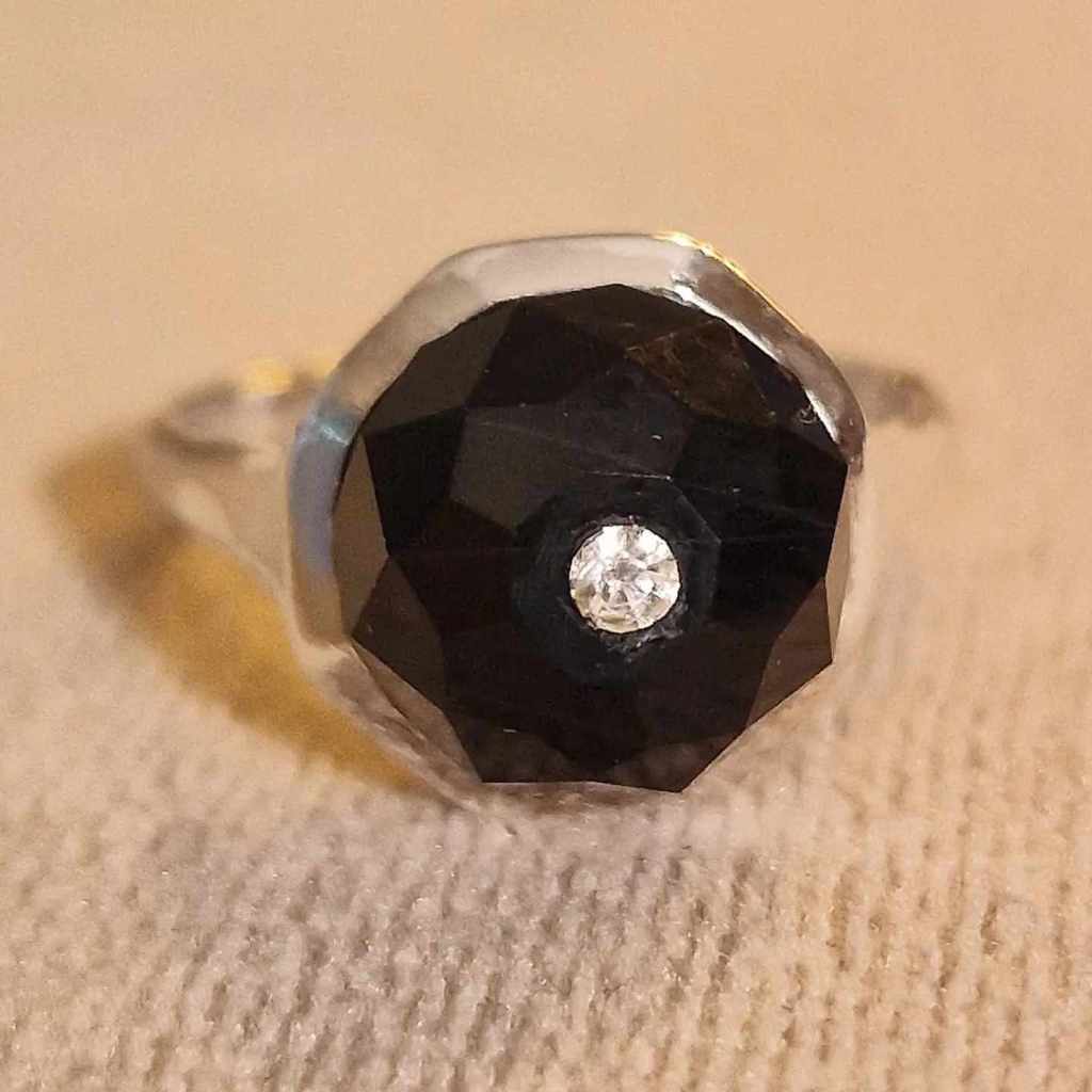 Bague ancienne en argent 925 sertie d’onyx facetté et d’une pierre blanche. Le bijou, de face et selon la lumière, révèle l’image d’une étoile dans une étoile. Toute une série de lignes et de motifs qui se répondent pour ce magnifique bijou ancien entièrement restauré dans son état d’origine.