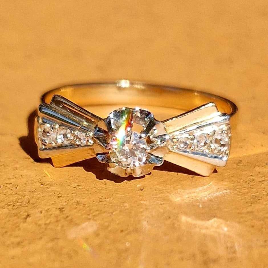 Somptueuse bague « nœud » ancienne art deco, or rose et blanc serti d’un diamant taille brillant monté sur chaton fleur et épaulé de diamants taille rose. L’ensemble forme un motif en nœud papillon des plus délicats. Très belle qualité du diamant (FvvS2) qui présente de très beaux feux.
