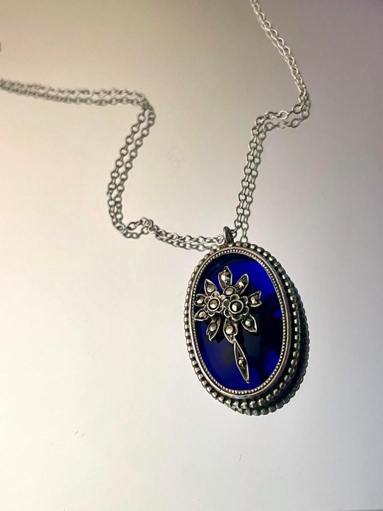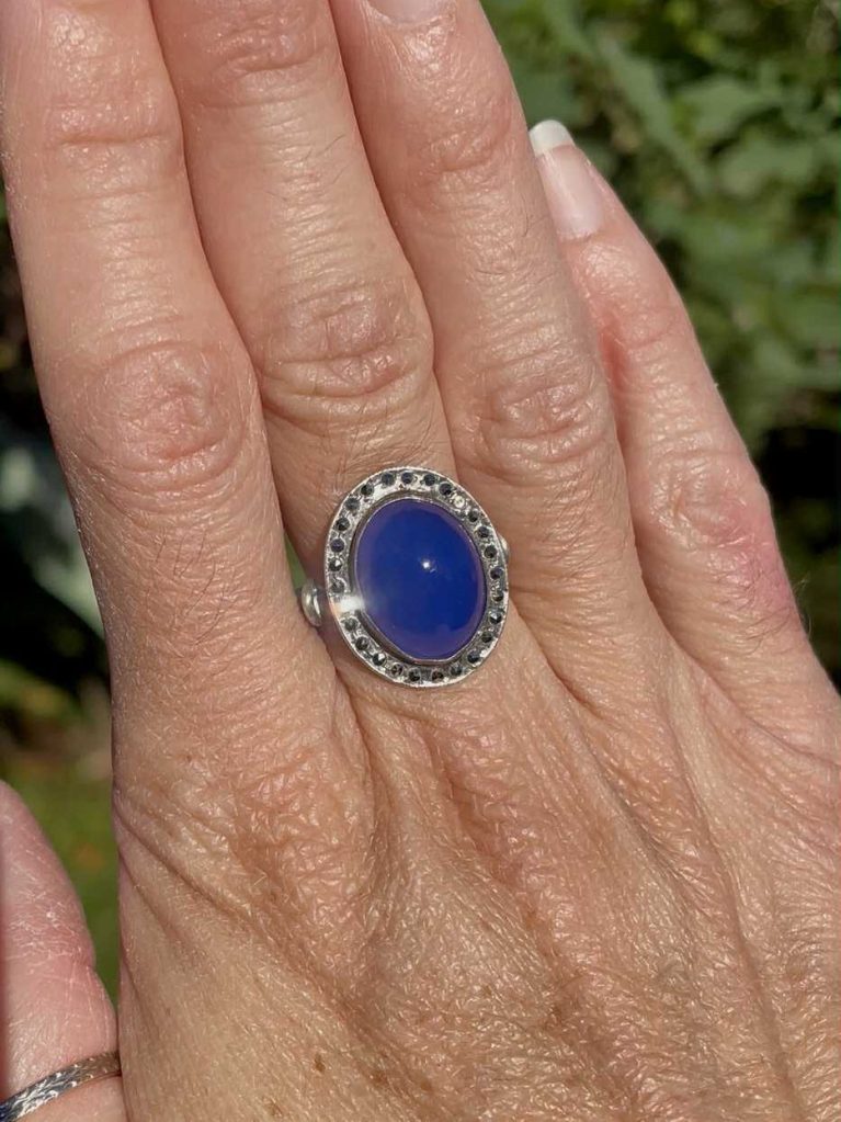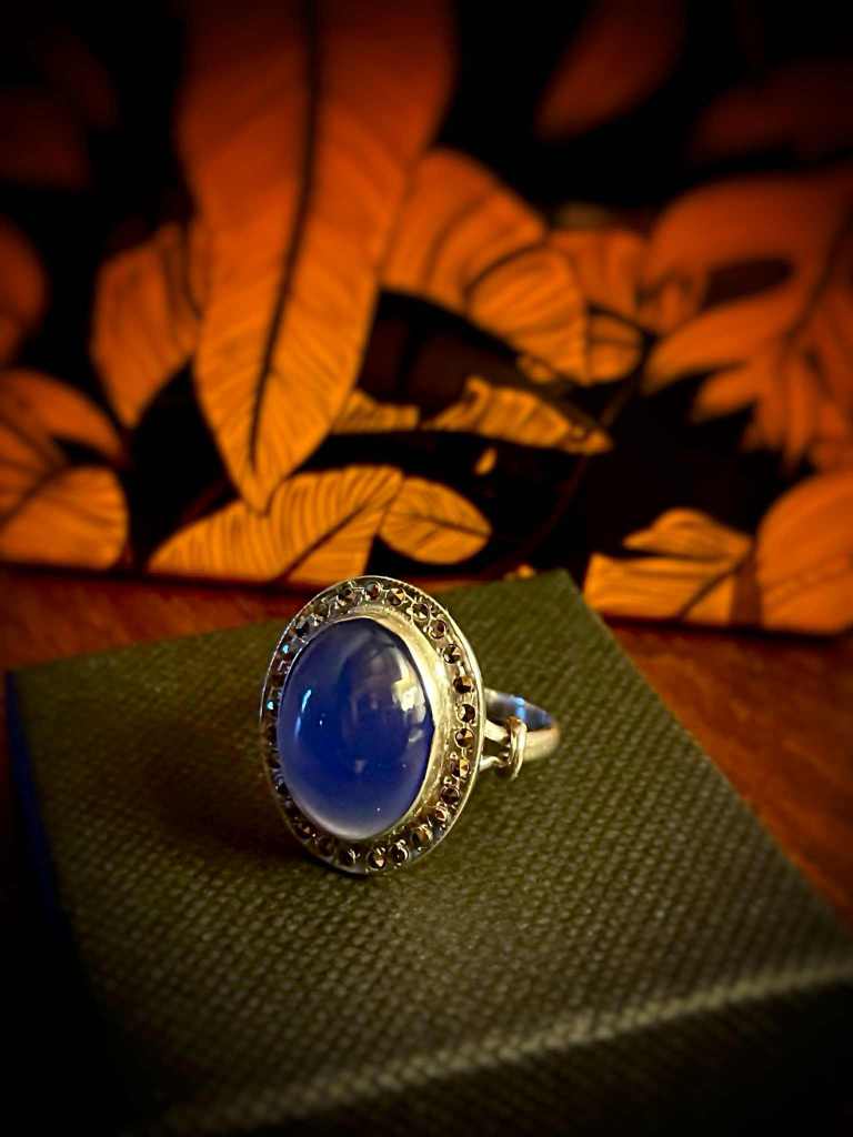 Évoquant la douceur des années 1925-30, cette bague ancienne en argent 800 dévoile une agate bleue en cabochon, profonde comme un ciel d’été au crépuscule. Nichée dans un délicat entourage serti de marcassites typique de l’entre-deux-guerres, la pierre semble respirer une lumière intérieure, offrant à la main une touche de mystère et d’élégance. Idéale pour celles et ceux qui recherchent un bijou original, chic et facile à porter, cette bague en argent au charme rétro s’accorde parfaitement avec tous les styles. Un choix parfait pour compléter une collection de bijoux anciens ou offrir un cadeau élégant.