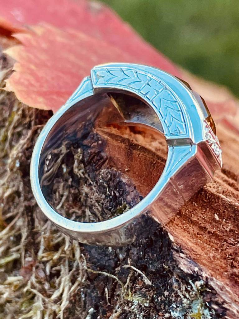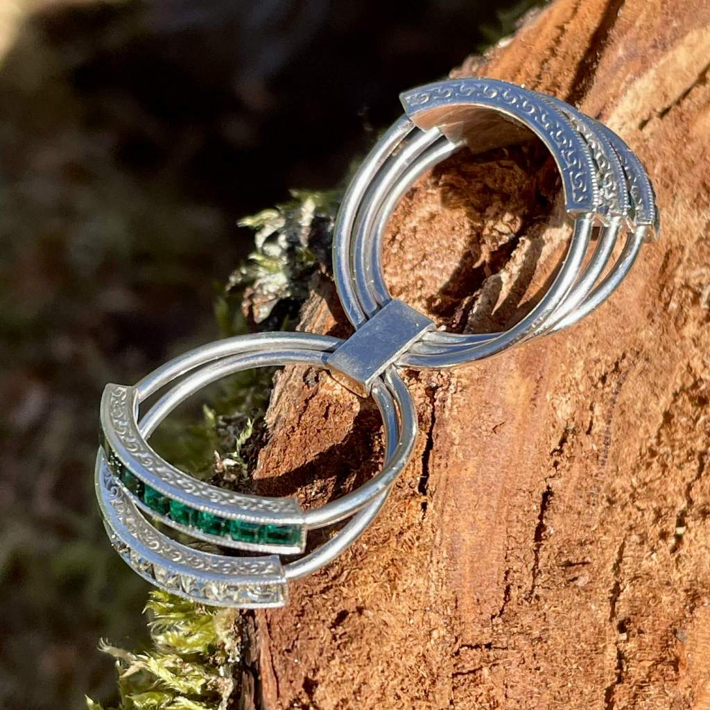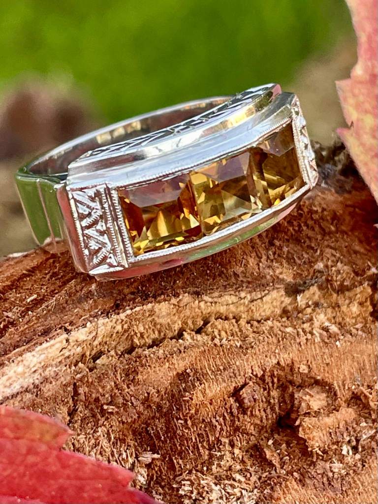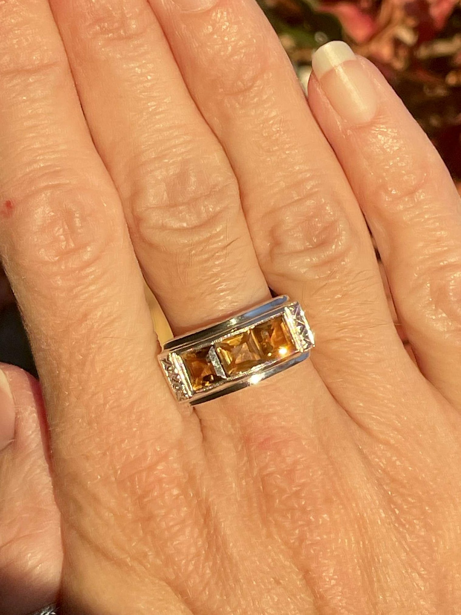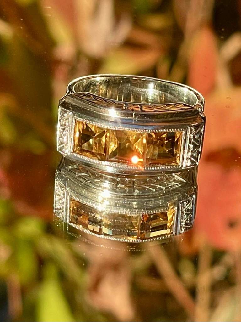 Éclatante et envoûtante, cette bague tank des années 1940 incarne la chaleur et la lumière des plus beaux couchers de soleil. Confectionnée avec soin en argent massif 925, cette pièce unique se pare de citrines naturelles taille princesse, aux reflets dorés et ambrés qui captent la lumière à chaque mouvement. Les pierres, finement serties dans un encadrement orné de détails gravés, créent un jeu de brillance fascinant, renforcé par une finition artisanale d’une grande finesse. Idéale pour apporter une touche solaire à votre look, cette bague est un véritable hommage à la beauté naturelle des minéraux et au savoir-faire joaillier des années 40.