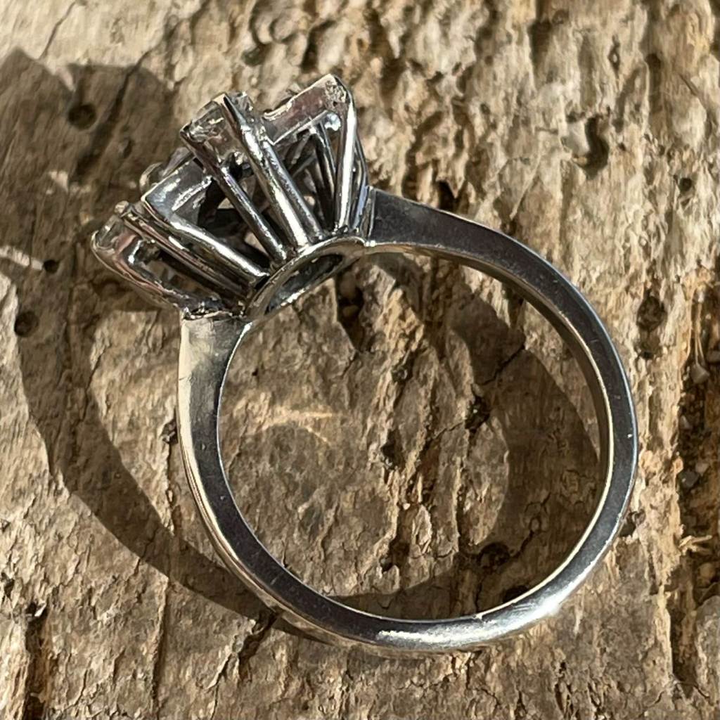 Magnifique bague vintage des années 60, en or blanc 18 ct sertie d’un remarquable diamant accompagné de brillants. Motif en marquise réinterprété de manière contemporaine, graphique et épurée, mettant en valeur tout l’éclat du diamant principal. L’anneau, comme le montage, n’ont subi aucune usure et sont en parfait état. La facture d’origine est fournie : prix d’acquisition 1200 euros.