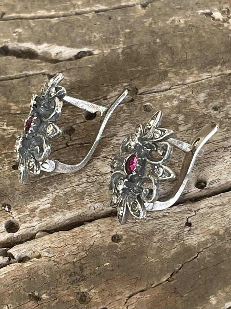 Superbe paire de boucles d’oreilles anciennes en argent 925, au magnifique design Liberty, emblématique du début du XXe siècle. Raffinées, féminines et pleines de caractère, ces dormeuses se distinguent par leur travail ajouré tout en courbes florales, typique de l’Art Nouveau anglais.Chaque boucle met en valeur une tourmaline bleue facettée, lumineuse et profonde, entourée d’un design végétal et souple parsemé de pierres taillées en rose, apportant une touche délicate et romantique. L’ensemble crée un contraste harmonieux et élégant, renforçant la finesse du motif sculpté dans l’argent.