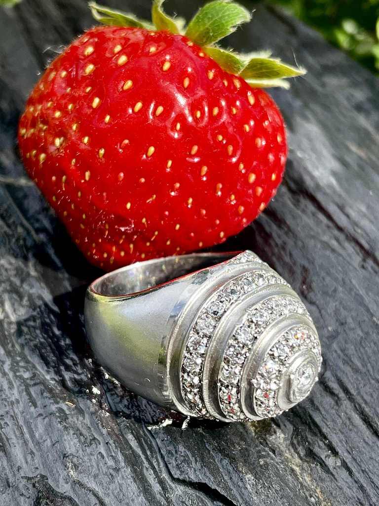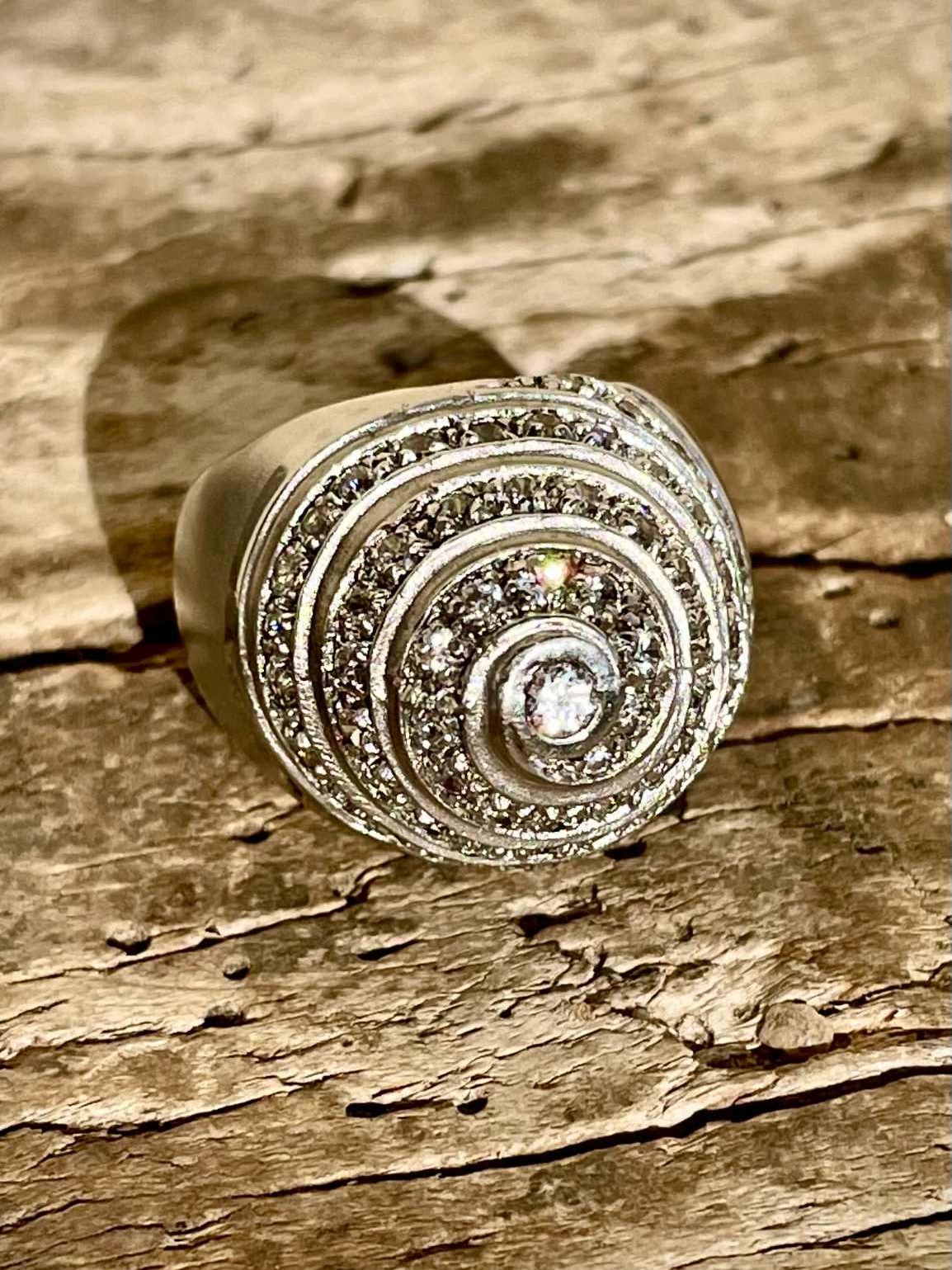 Découvrez l’élégance graphique de cette bague cocktail vintage en argent, un bijou d’exception dont le design en cercles concentriques scintillants met en valeur une superbe pierre centrale entourée d’un pavage étincelant. Avec son style résolument Retro, ses reliefs soignés et son éclat profond, cette bague attire immédiatement la lumière et sublime la main en toute occasion. Idéale pour compléter une tenue habillée ou apporter une touche de caractère au quotidien, elle incarne le savoir-faire traditionnel et le charme des bijoux anciens. Un choix raffiné pour les amatrices de pièces fortes, originales et intemporelles, disponible dès maintenant dans la collection David Bijoux.