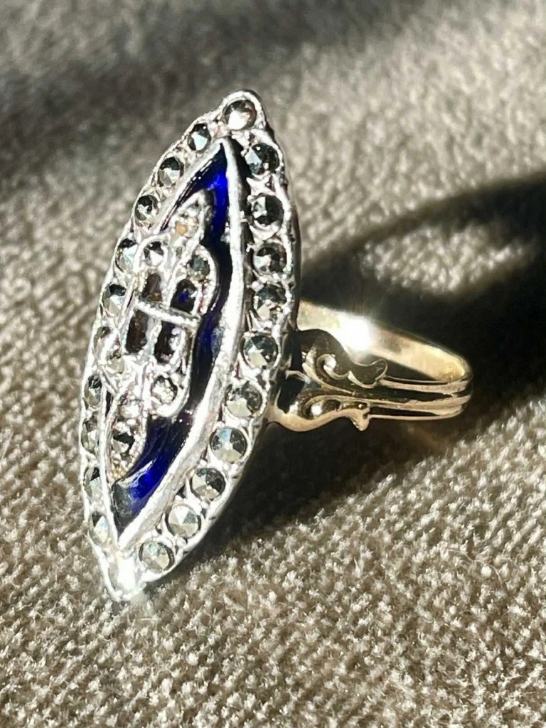 Bague Marquise Ancienne Napoléon III – Or Jaune 18 ct, Argent et Émail Bleu Nuit