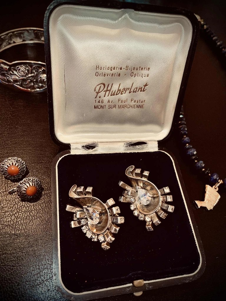 Présentées dans leur écrin d’origine estampillé Huberlant, maison belge de renom, ces boucles d’oreilles constituent une pièce de collection idéale pour les amateurs de bijoux vintage, de haute joaillerie moderniste et de créations issues des grands ateliers parisiens.